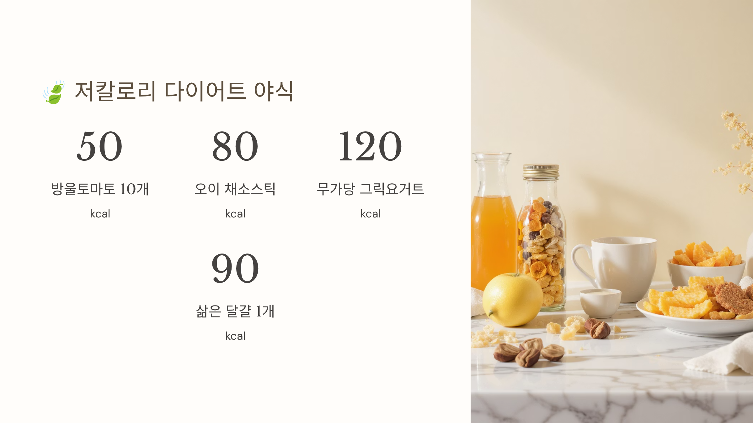 다이어트 중이라고 야식을 완전히 포기할 필요는 없어요. 현명한 선택과 조리법만 알면 100-200칼로리 내외의 가벼운 야식을 즐길 수 있답니다. 중요한 건 양보다 질! 영양가는 높으면서 칼로리는 낮은 식재료를 활용하는 것이 핵심이에요.