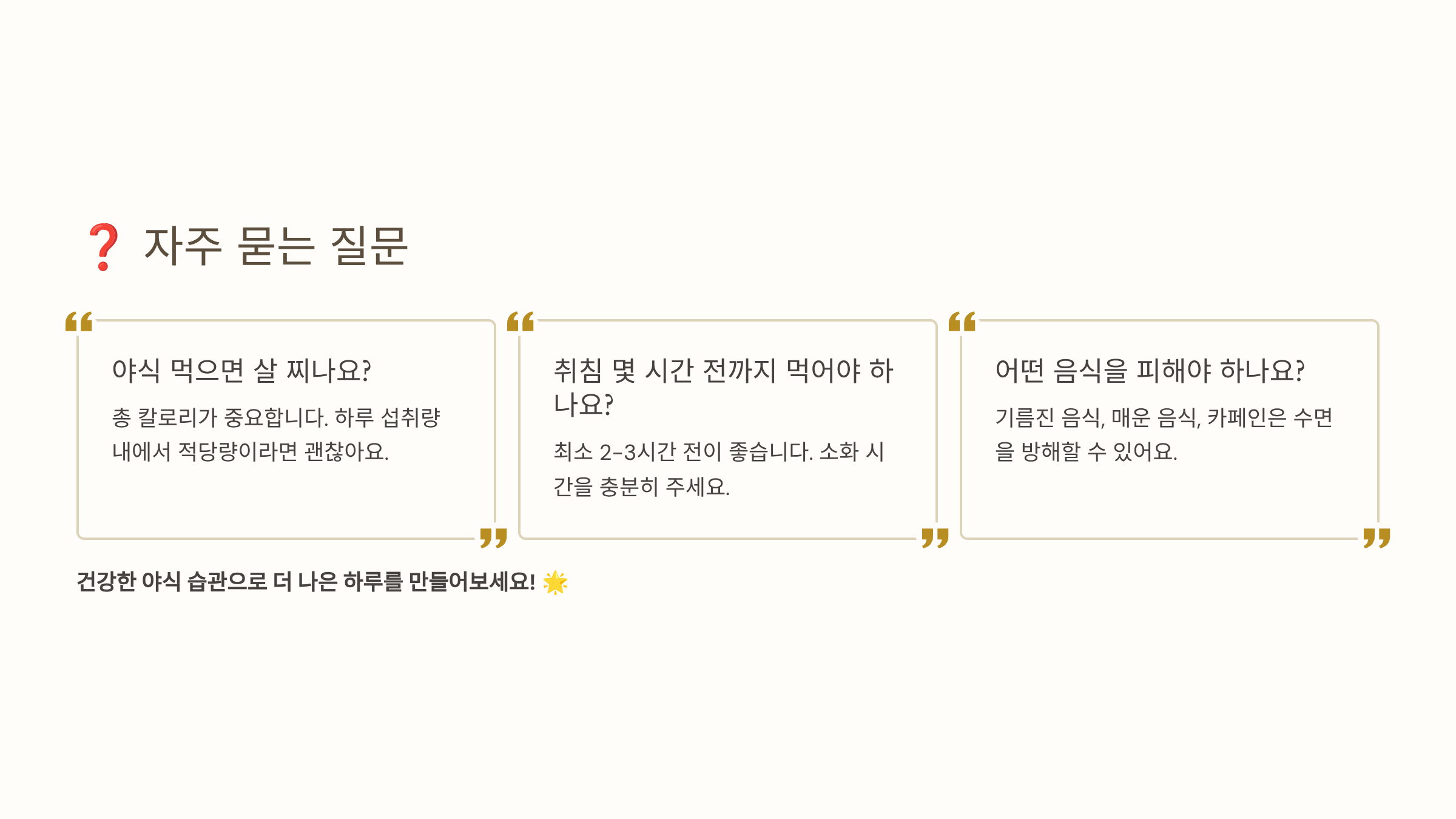 A8. 과도한 야식은 비만, 역류성 식도염, 수면 장애를 유발할 수 있어요. 하지만 건강한 재료로 적당량을 먹는다면 스트레스 해소와 영양 보충에 도움이 됩니다. 중요한 건 균형이에요. 주 2-3회, 200칼로리 이내로 즐기면 문제없답니다!