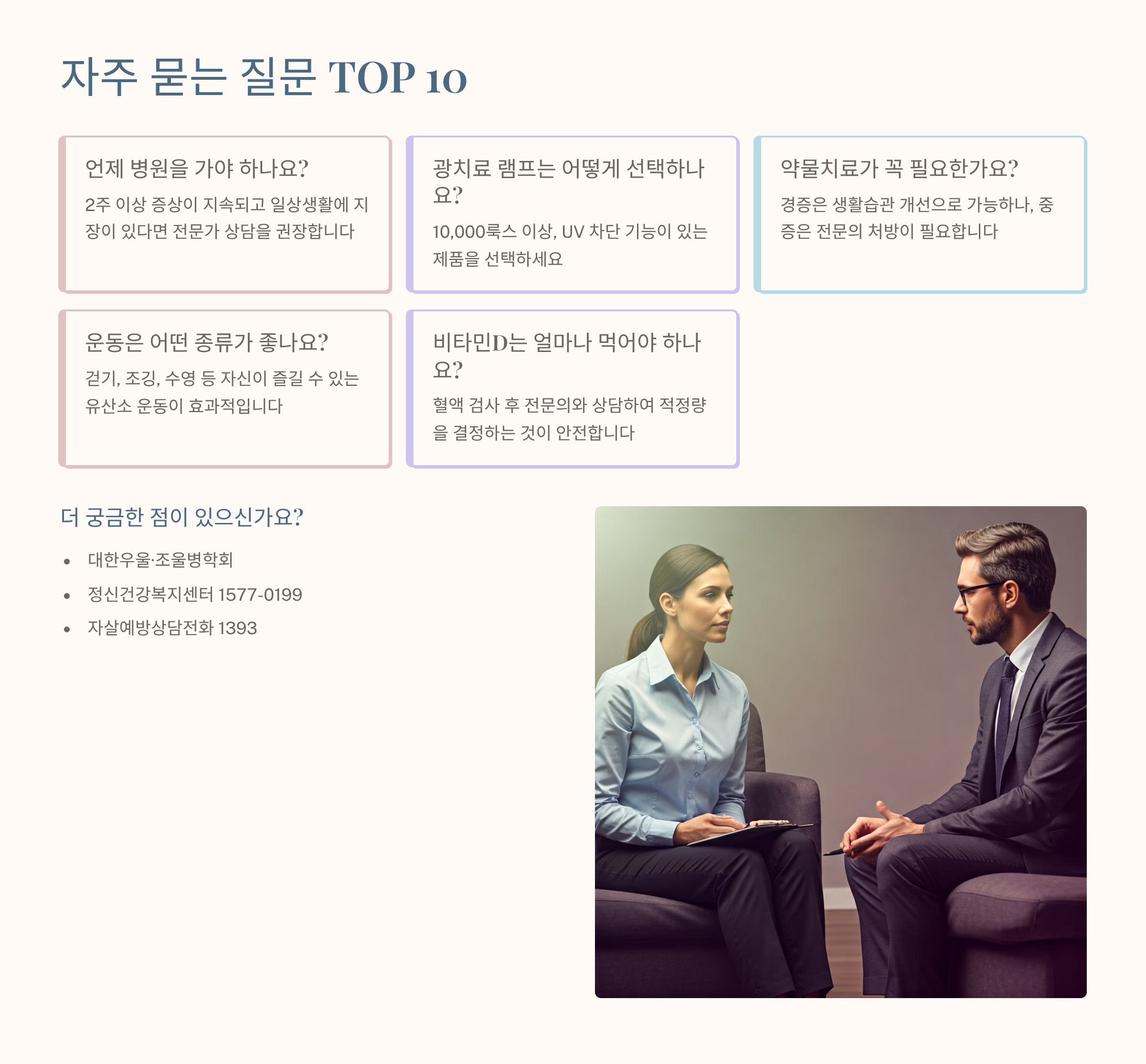 A30. 정신건강의학과 진료는 건강보험이 적용되어 부담이 크지 않아요. 광선요법 기기는 5-30만 원대로 구매 가능하고, 전국 정신건강복지센터에서는 무료 상담 서비스도 제공하고 있어요.