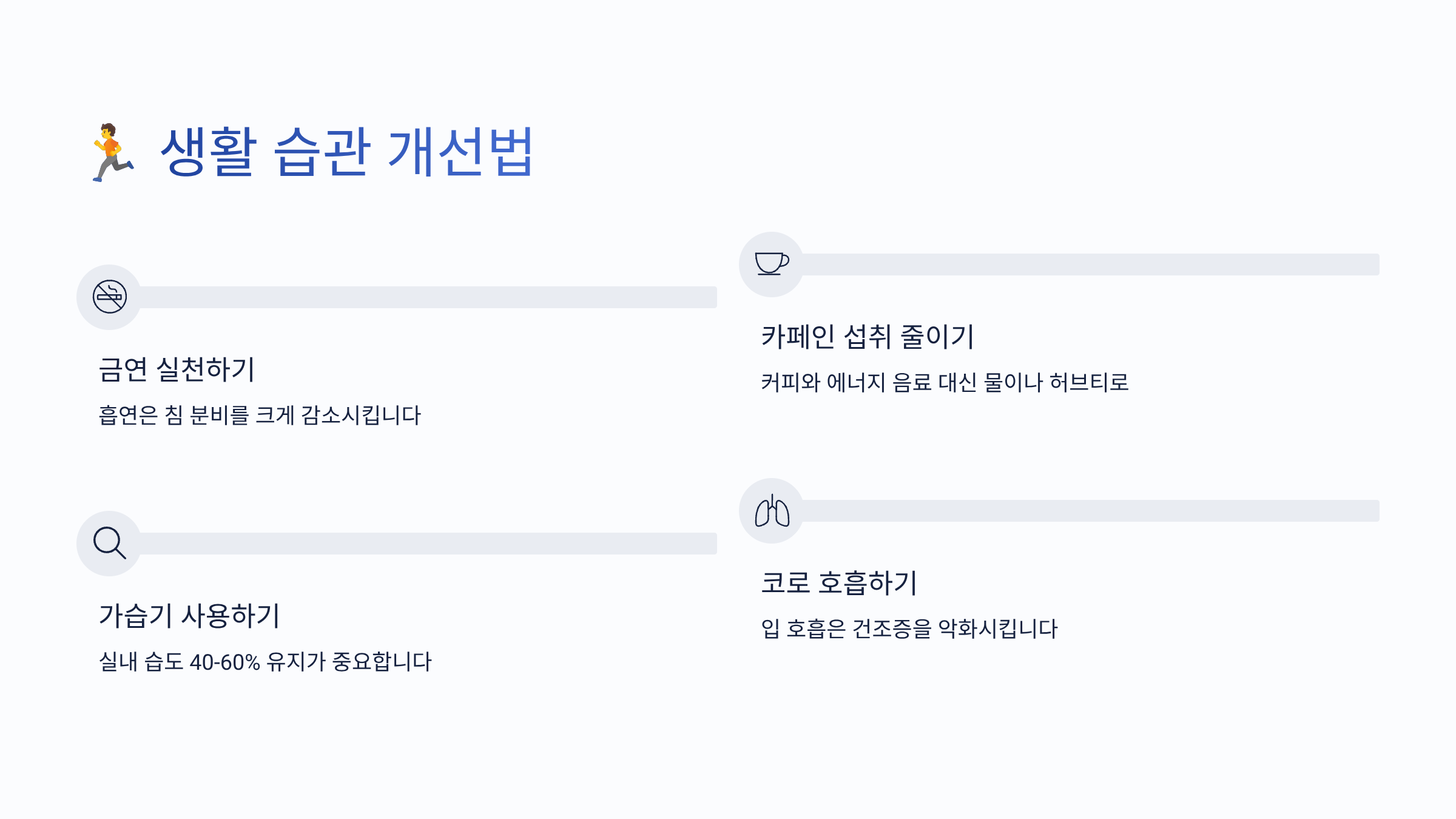 수면 습관도 개선해야 해요. 코골이나 구강 호흡은 밤새 입안을 건조하게 만들어요. 옆으로 누워 자는 자세가 도움이 될 수 있고, 베개 높이를 조절해 기도가 막히지 않도록 하는 것도 중요해요. 수면무호흡증이 의심된다면 전문의 상담을 받아보세요.