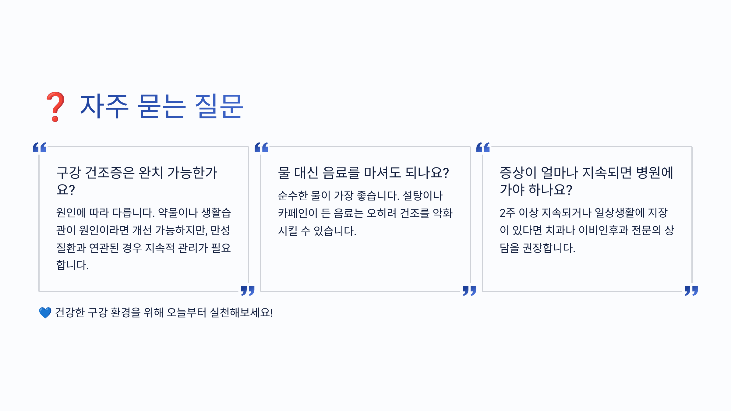 면책 조항: 이 글은 일반적인 정보 제공을 목적으로 작성되었으며, 의학적 조언을 대체할 수 없습니다. 구강 건조증이 지속되거나 심각한 경우 반드시 전문의와 상담하시기 바랍니다. 개인의 건강 상태에 따라 적절한 치료 방법이 다를 수 있으므로, 자가 진단이나 치료보다는 전문가의 도움을 받으시길 권합니다.