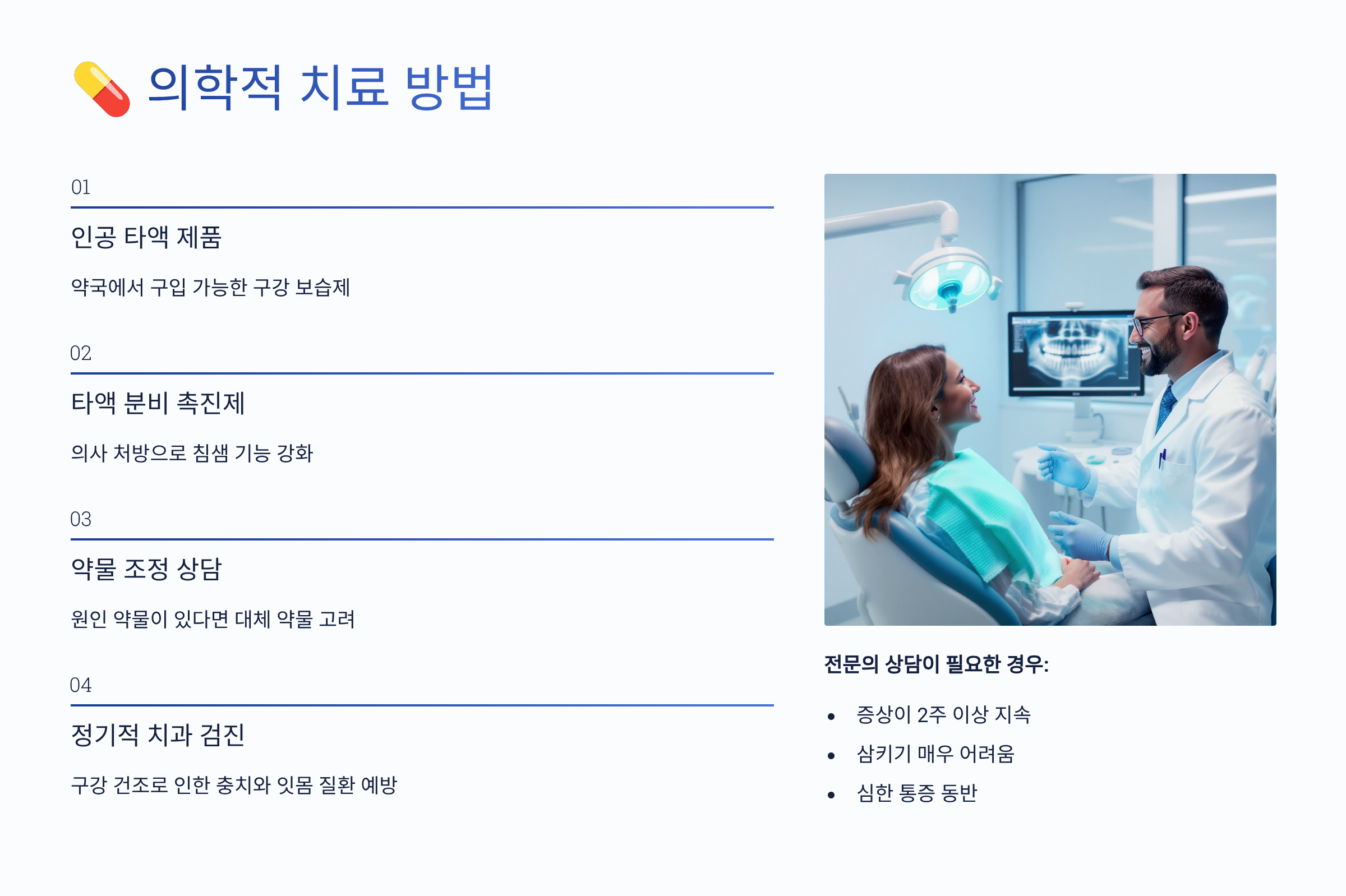 생활 습관 개선으로도 호전되지 않는다면 의학적 치료를 고려해야 해요. 가장 먼저 시도할 수 있는 것은 인공 타액 제품이에요. 처방전 없이 약국에서 구입할 수 있는 구강 보습제, 스프레이, 젤 등이 있어요. 이런 제품들은 즉각적인 완화 효과가 있고 부작용도 거의 없답니다.