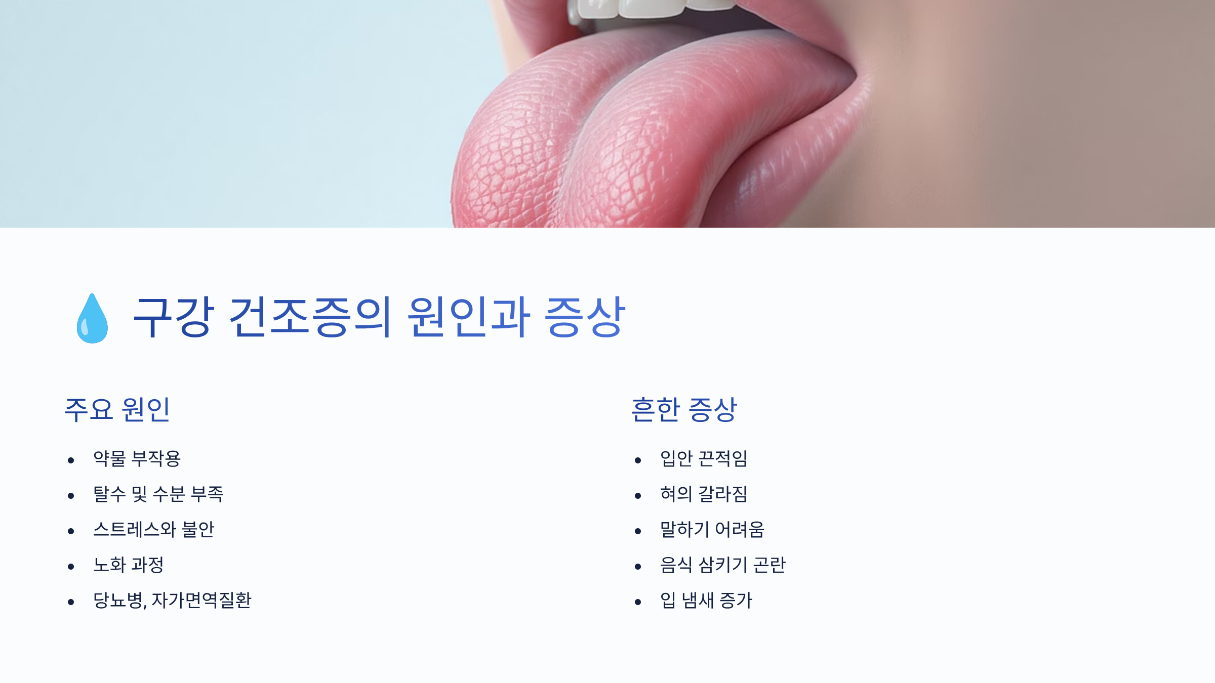 구강 건조증은 침 분비가 줄어들어 입안이 마르는 증상으로, 일상생활에 큰 불편함을 줄 수 있어요. 많은 분들이 단순히 물을 마시면 해결될 거라 생각하지만, 실제로는 체계적인 관리가 필요한 증상이랍니다. 특히 밤에 입이 마르거나 말할 때 불편함을 느끼신다면 이 글이 도움이 될 거예요.