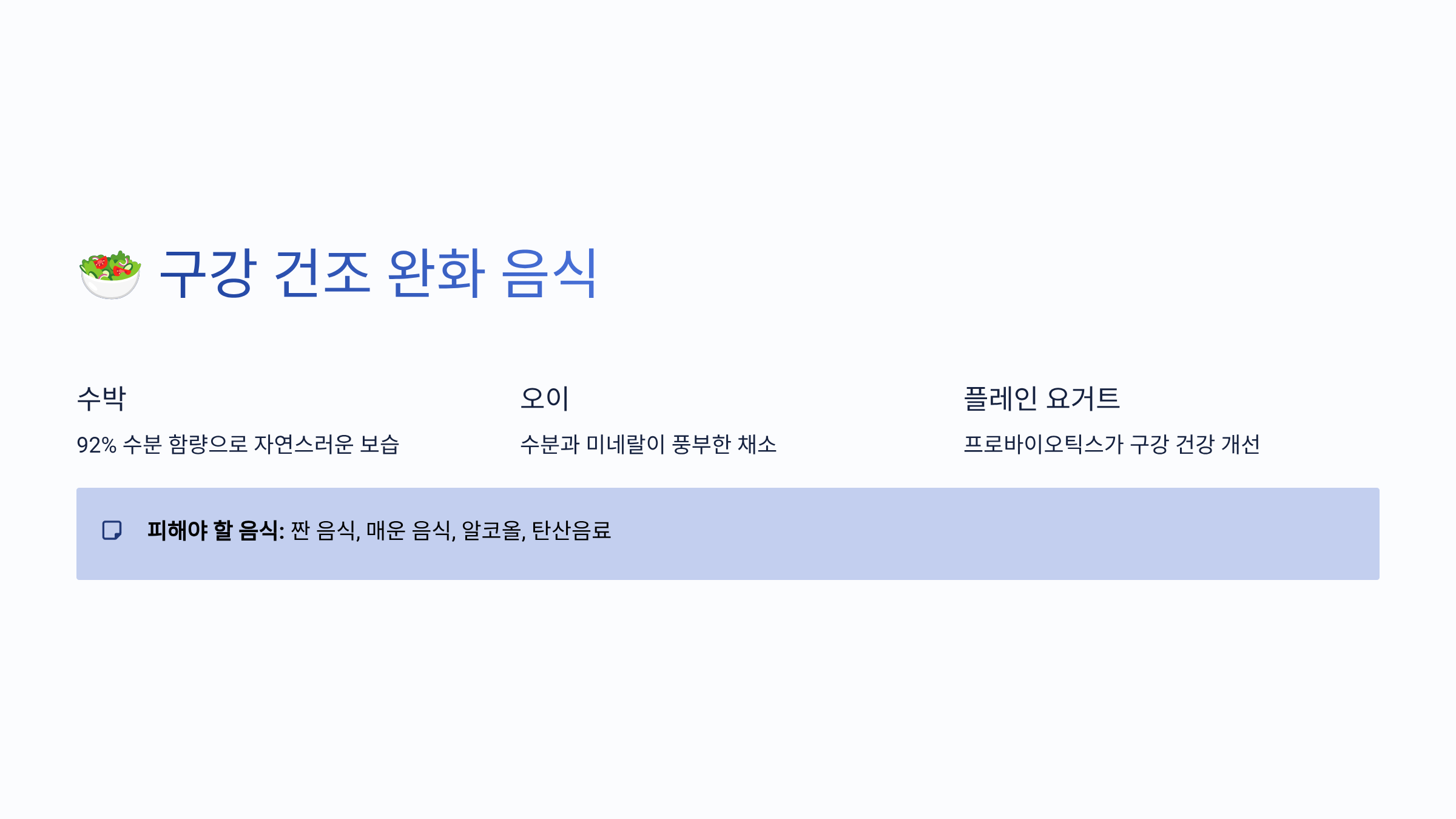 음식 선택만 잘해도 구강 건조증을 크게 개선할 수 있어요! 수분 함량이 높은 과일과 채소를 많이 먹는 것이 기본이에요. 수박, 오이, 토마토, 딸기, 멜론 같은 음식들은 90% 이상이 수분이라 입안을 촉촉하게 해 준답니다. 특히 수박은 여름철 구강 건조 완화에 최고예요! 🍉