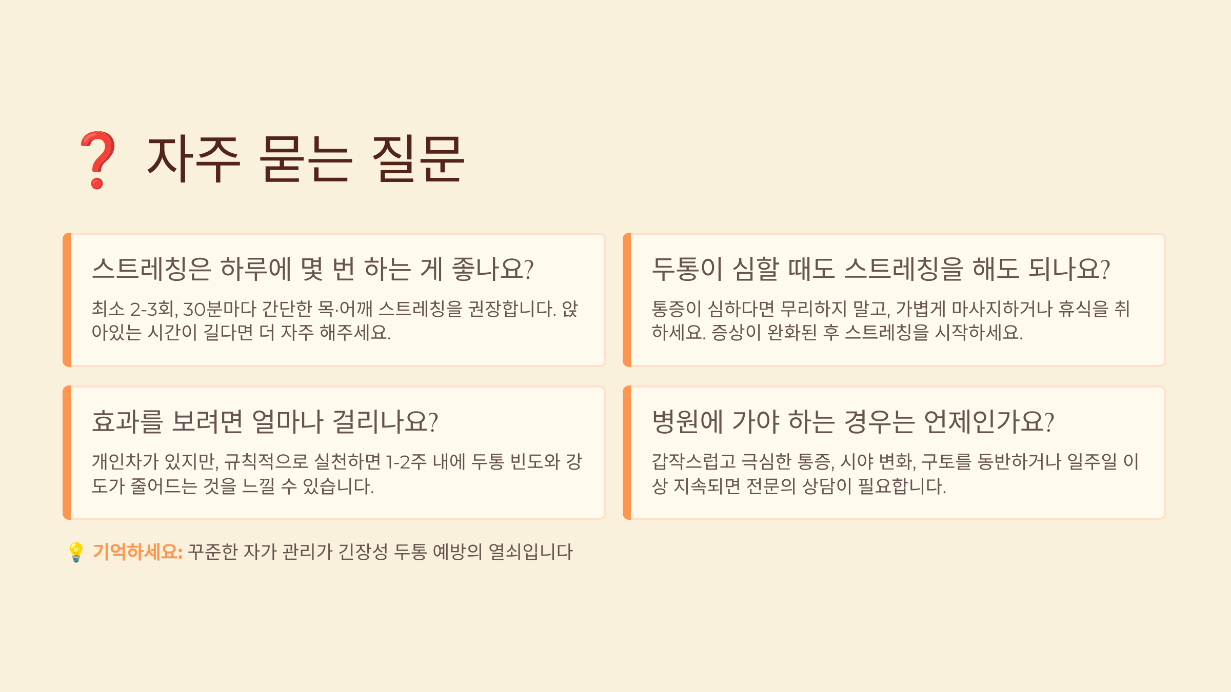 A3. 2-3주간 꾸준히 스트레칭을 했는데도 두통이 지속되거나 악화된다면 전문의 진료를 받아보세요. 경추 디스크, 턱관절 장애, 안구 질환 등 다른 원인이 있을 수 있어요. 또한 두통의 양상이 갑자기 변하거나, 발열, 시야장애, 의식저하 등이 동반되면 즉시 병원을 방문해야 해요.