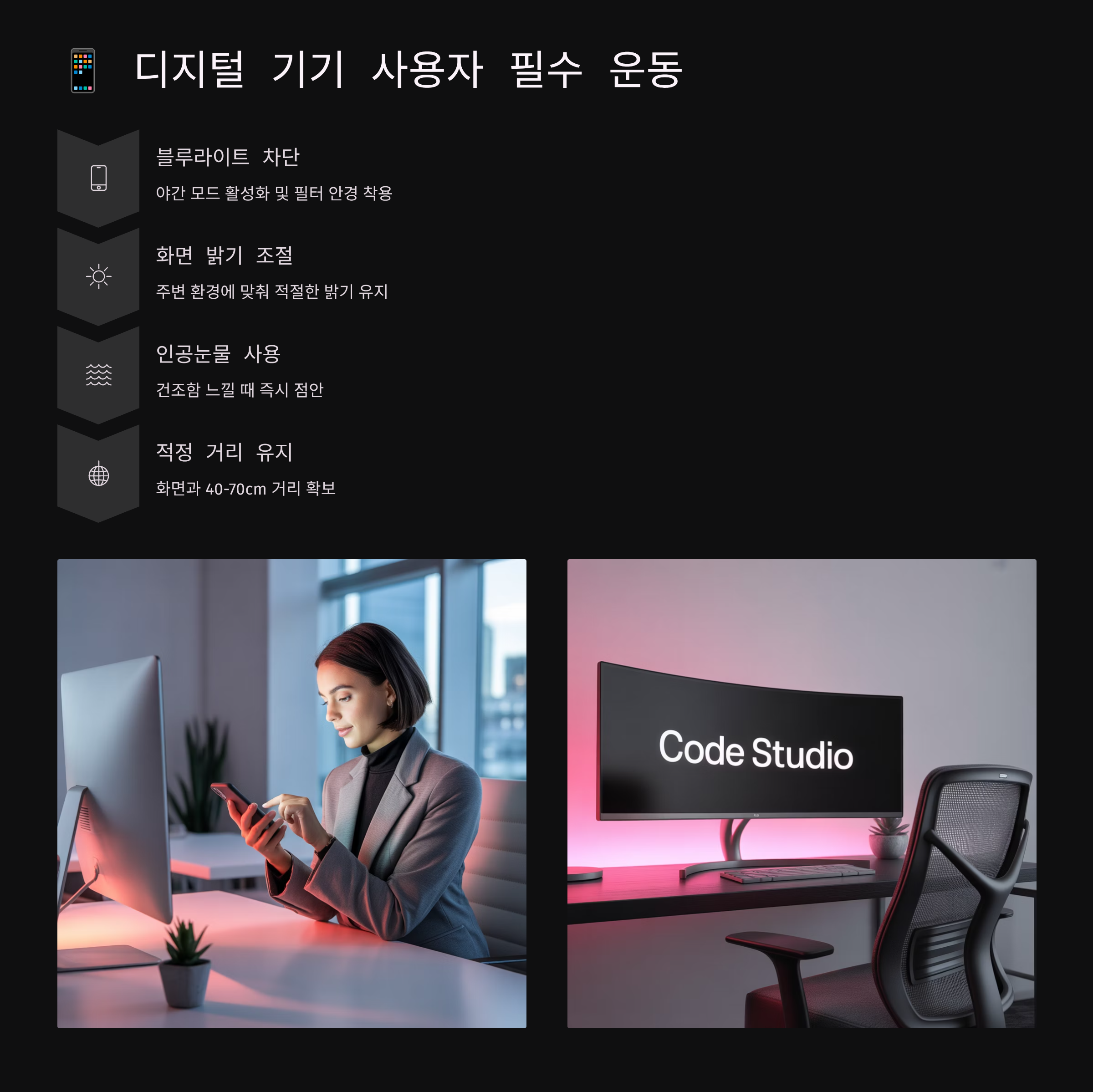 퇴근 전 '눈 정리 운동'도 잊지 마세요. 컴퓨터를 끄기 전 5분 정도 눈 스트레칭을 하고, 따뜻한 물수건으로 눈을 찜질해요. 이렇게 하면 하루 동안 쌓인 눈의 피로를 풀고 편안한 저녁 시간을 보낼 수 있답니다! 🌙
