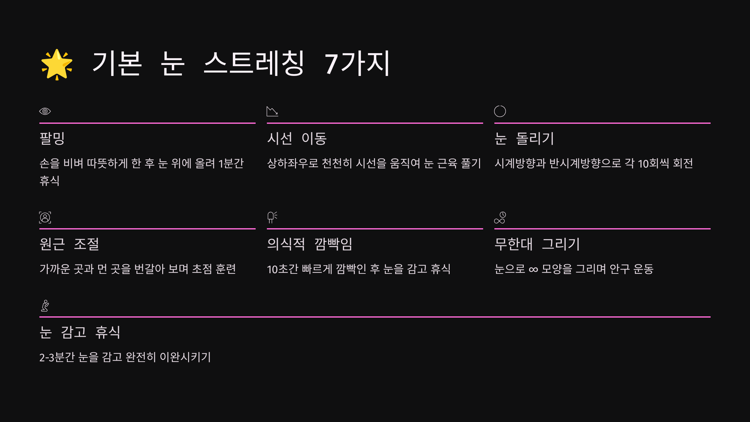 이 7가지 운동을 매일 꾸준히 하면 눈의 피로가 확실히 줄어들어요. 특히 업무 중간중간에 2-3가지씩 골라서 하면 효과적이랍니다. 처음엔 귀찮게 느껴질 수 있지만, 습관이 되면 자연스럽게 하게 돼요. 눈 건강은 한 번 나빠지면 회복하기 어려우니 미리미리 관리하는 것이 중요해요! 😊