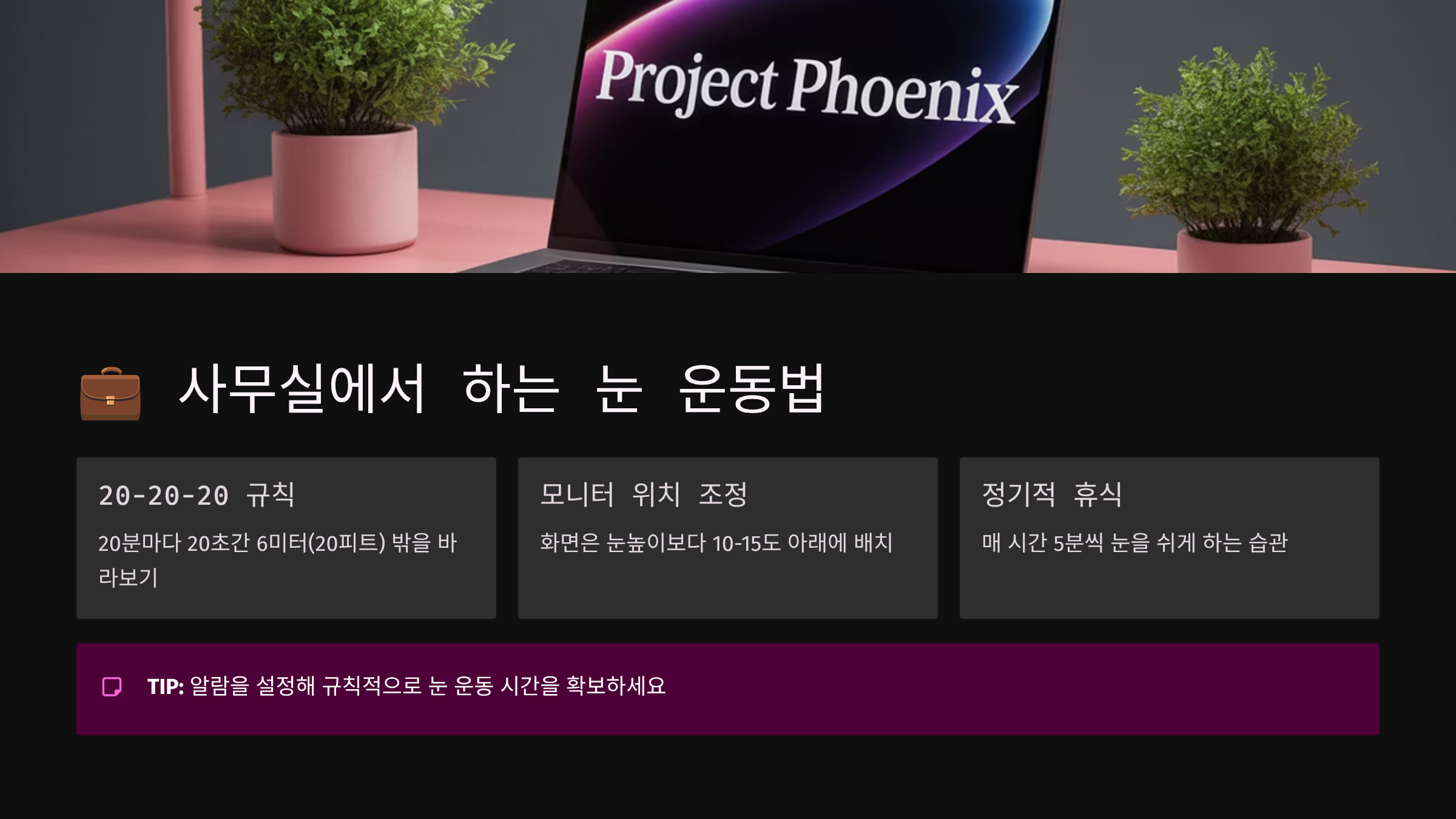 동료들과 함께 '눈 운동 타임'을 정해 보는 것은 어떨까요? 오후 3시에 알람을 맞춰두고 다 같이 2-3분간 눈 운동을 하는 거예요. 혼자 하면 잊기 쉽지만 함께 하면 꾸준히 실천할 수 있어요. 실제로 일본의 많은 기업에서는 이런 제도를 시행하고 있답니다!