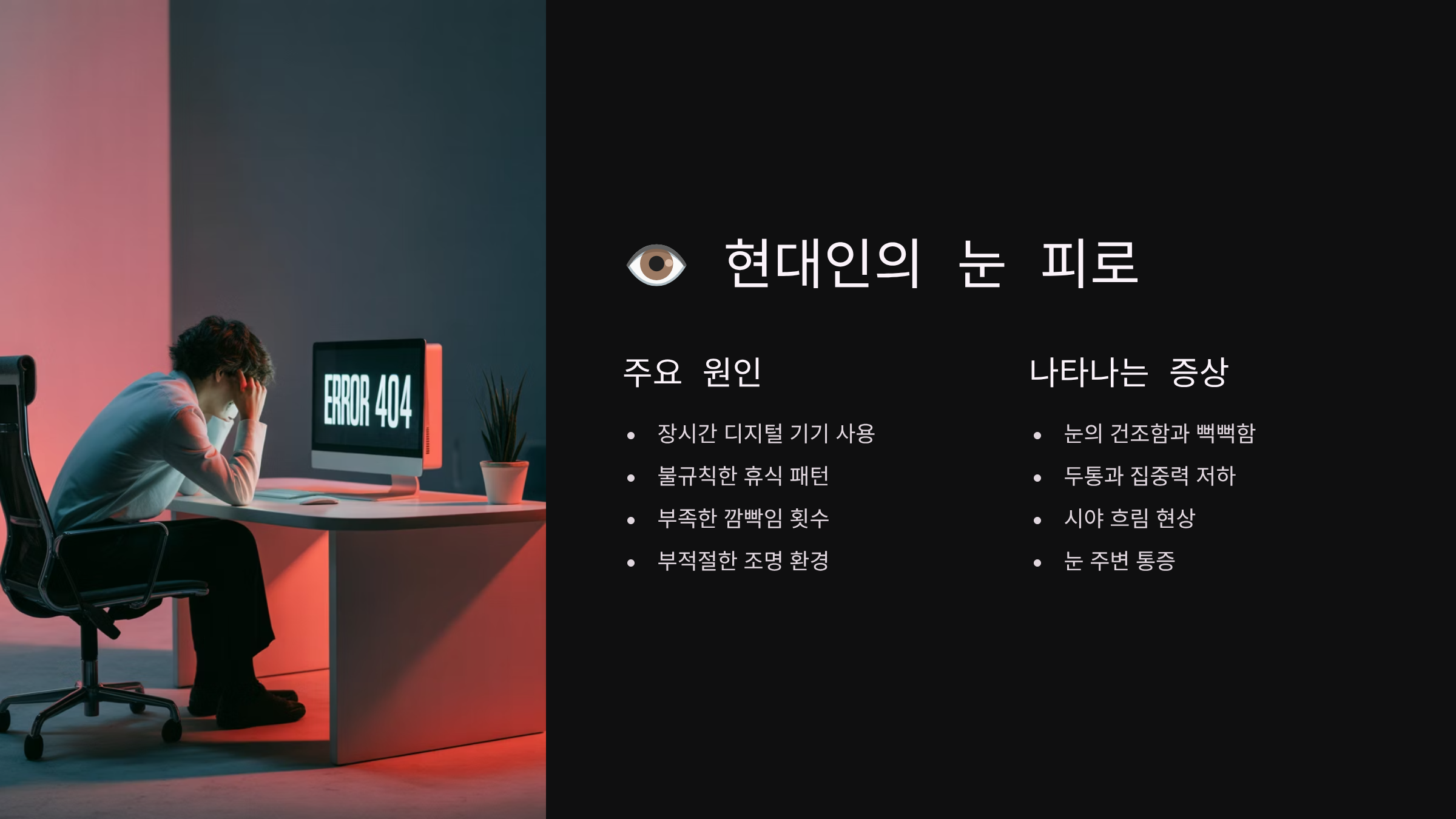 하루 종일 컴퓨터와 스마트폰을 보며 생활하는 현대인들에게 눈 건강은 정말 중요한 문제가 되었어요. 특히 코로나19 이후 재택근무와 온라인 수업이 늘어나면서 디지털 기기 사용 시간이 급격히 증가했답니다. 눈의 피로는 단순히 불편함을 넘어 두통, 어깨 결림, 집중력 저하까지 이어질 수 있어요.