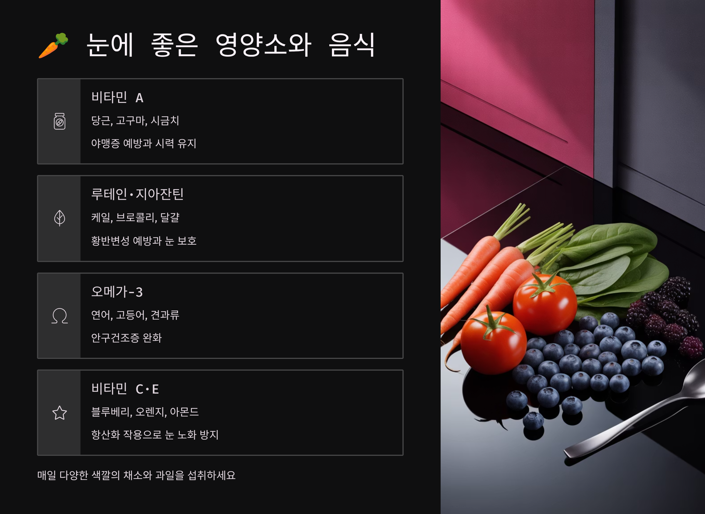 눈 건강에 가장 중요한 영양소는 비타민 A예요. 당근, 고구마, 시금치 등 주황색과 녹색 채소에 풍부하게 들어있어요. 비타민 A는 망막의 로돕신 생성에 필수적이고, 야맹증 예방에도 효과적이랍니다. 하루 권장량은 성인 기준 700-900㎍이에요.