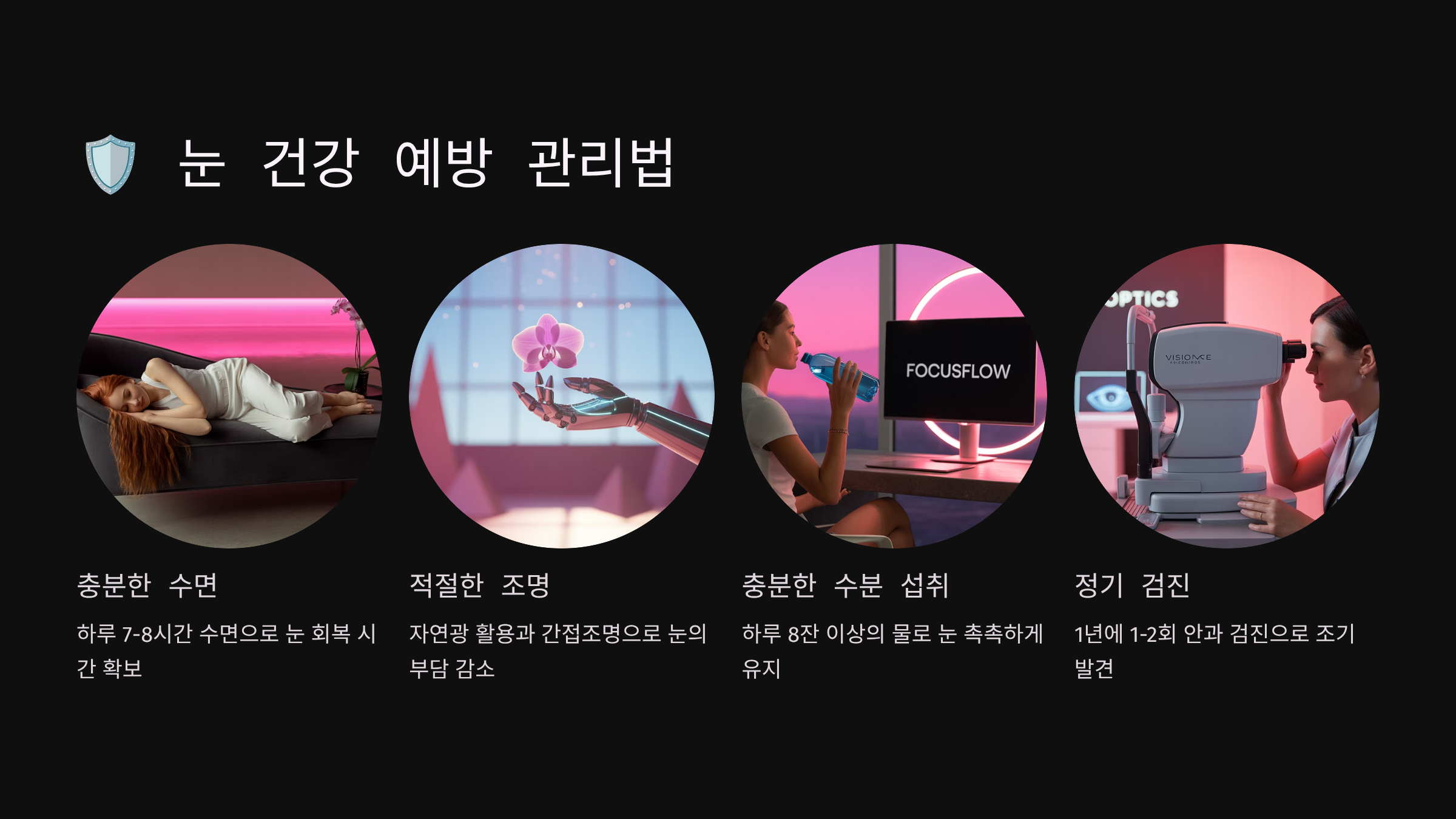 본 콘텐츠는 일반적인 정보 제공을 목적으로 작성되었으며, 의학적 조언을 대체할 수 없습니다. 눈 관련 증상이 지속되거나 악화되는 경우 반드시 안과 전문의의 진료를 받으시기 바랍니다. 개인의 건강 상태에 따라 적용 방법이 다를 수 있으므로 전문가와 상담 후 실천하시는 것을 권장합니다.