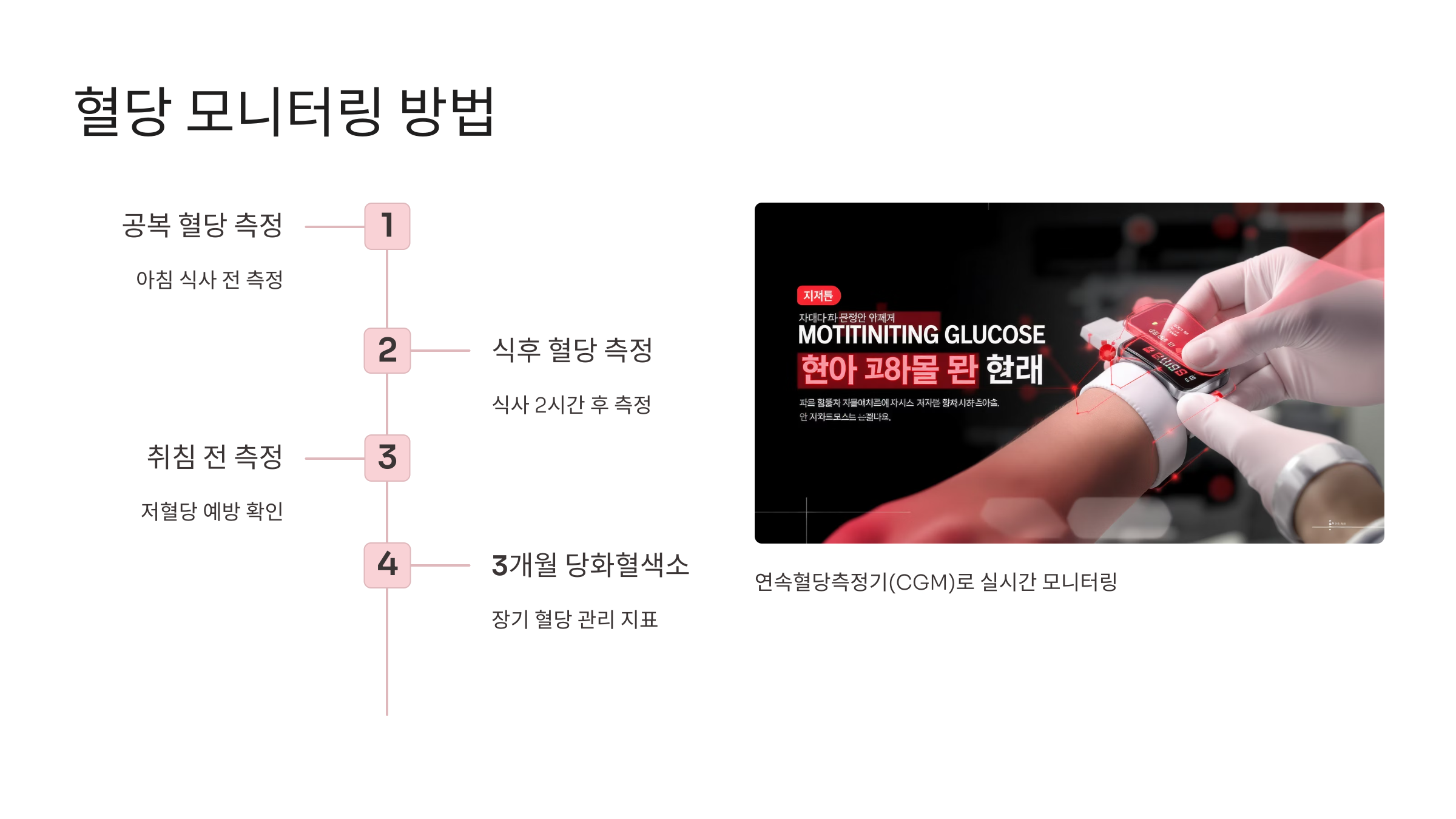 | 자가혈당측정기 | 1-4회/일 | 저렴, 즉시 확인 | 채혈 필요 |