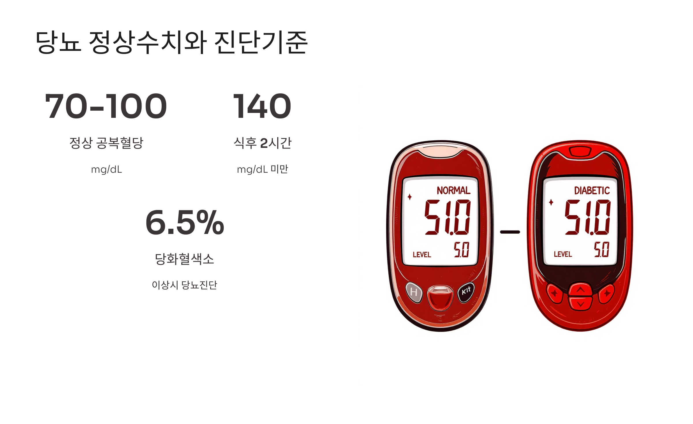 | 식후 2시간 | 140mg/dL 미만 | 140-199mg/dL | 200mg/dL 이상 |