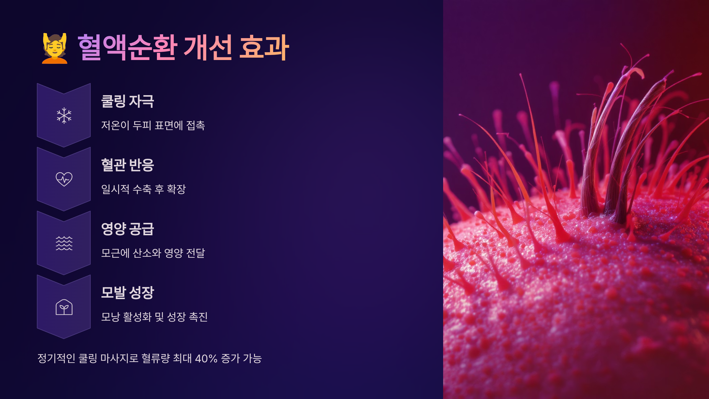 두피의 혈액순환은 건강한 모발 성장의 핵심이에요. 모낭은 혈액을 통해 필요한 영양분과 산소를 공급받는데, 혈액순환이 원활하지 않으면 모발이 가늘어지고 탈락하기 쉬워진답니다. 쿨링 마사지는 이러한 혈액순환을 극대화시키는 효과적인 방법이에요. 차가운 자극과 마사지의 물리적 압력이 결합되어 두피 전체의 미세혈관까지 혈류를 증가시켜요.