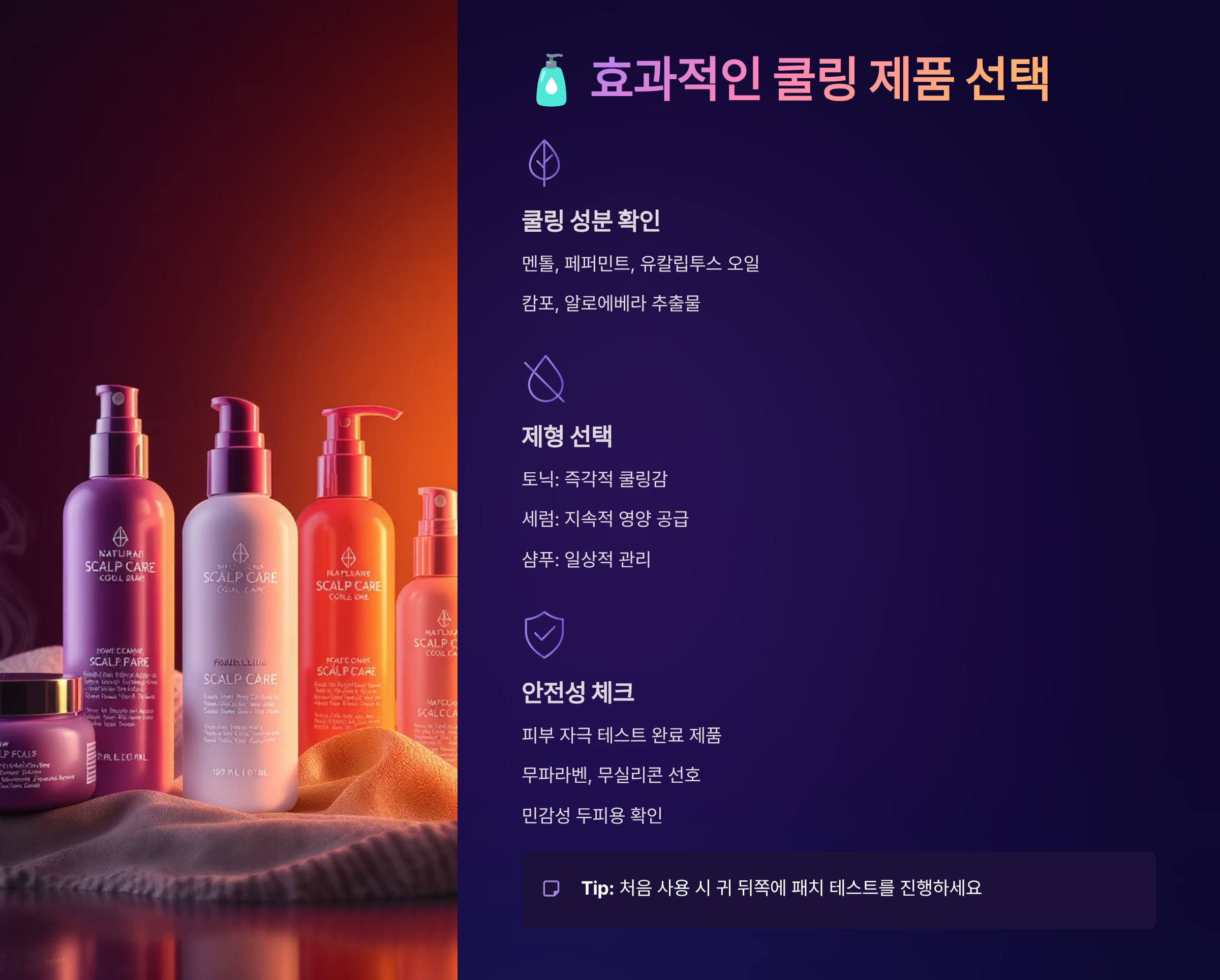 제형별 특징도 중요한 선택 기준이에요. 토닉 타입은 가볍고 흡수가 빨라 매일 사용하기 좋아요. 세럼 타입은 영양 성분이 농축되어 있어 집중 케어에 적합하답니다. 젤 타입은 쿨링감이 오래 지속되고 끈적임이 적어 여름철에 인기가 많아요. 오일 타입은 건조한 두피에 보습과 쿨링을 동시에 제공하지만 지성 두피에는 부담스러울 수 있어요. 스프레이 타입은 휴대가 간편하고 언제 어디서나 사용할 수 있다는 장점이 있어요.