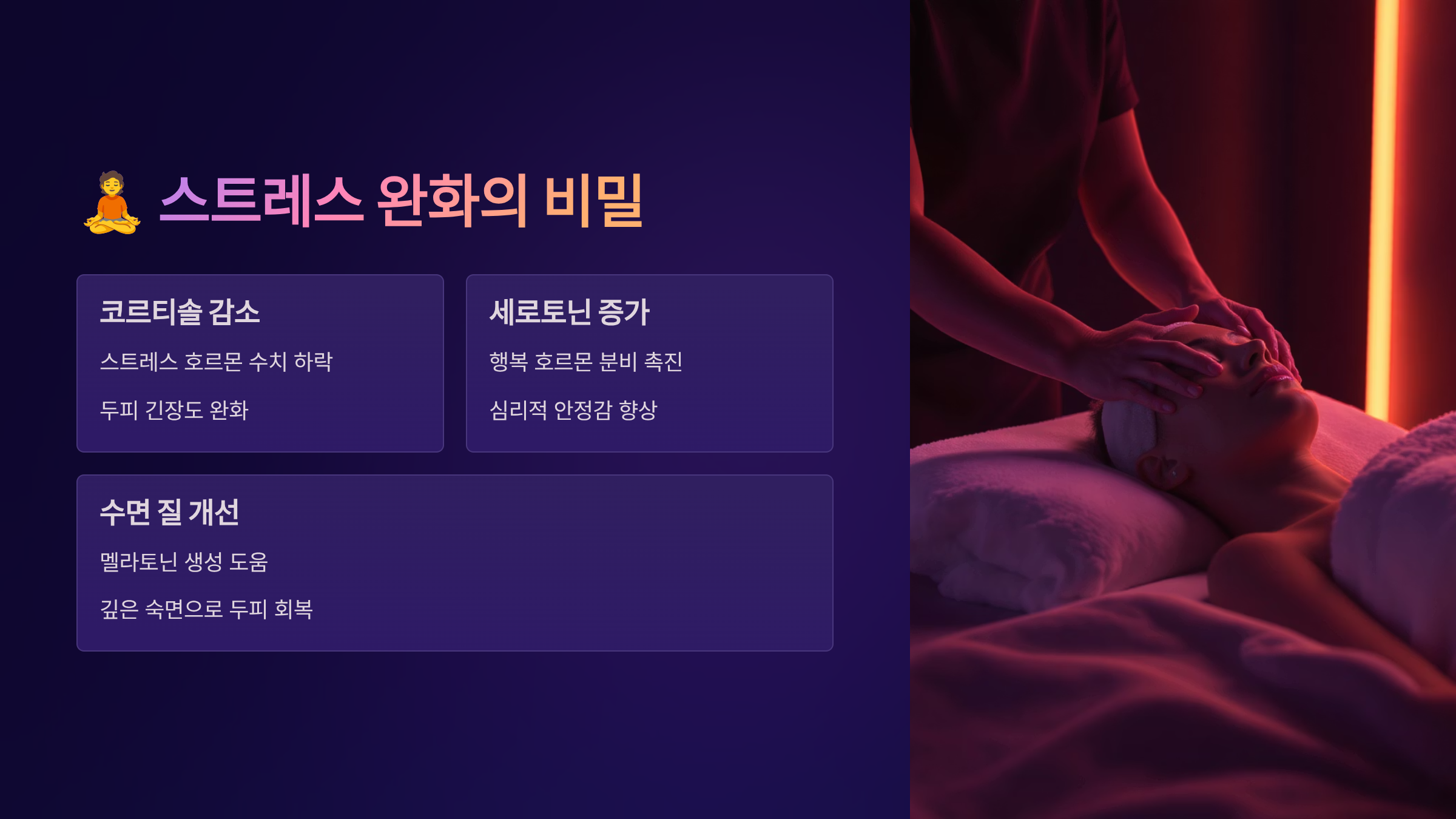 심리학 연구에 따르면 촉각 자극은 옥시토신 분비를 촉진한다고 해요. 옥시토신은 '사랑의 호르몬'으로 불리며 스트레스 호르몬인 코르티솔을 중화시키는 역할을 한답니다. 쿨링 마사지 중 느껴지는 시원함과 압력은 뇌에 긍정적인 신호를 보내 세로토닌과 도파민 분비를 증가시켜요. 이러한 신경전달물질의 균형은 우울감과 불안을 감소시키고 전반적인 정신 건강을 향상해요.