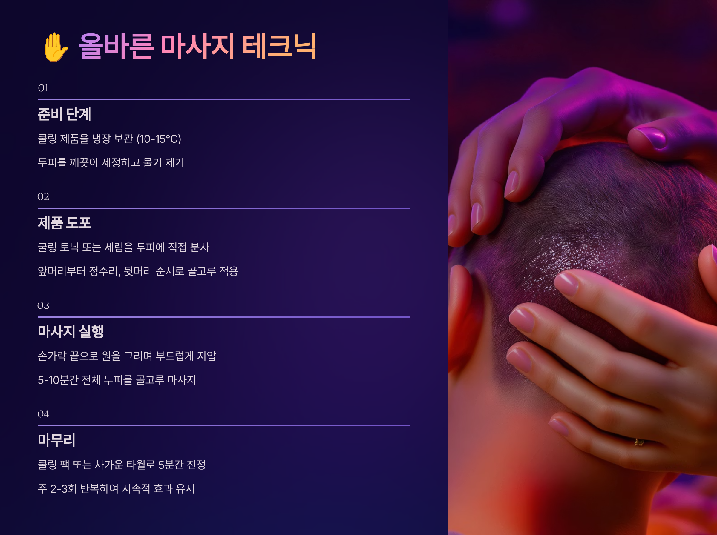 효과적인 두피 쿨링 마사지를 위해서는 올바른 테크닉을 익히는 것이 중요해요. 무작정 차갑게 하거나 세게 문지르는 것은 오히려 두피에 자극을 줄 수 있답니다. 전문가들이 권장하는 쿨링 마사지 방법은 온도, 압력, 시간, 방향을 체계적으로 조절하는 것이에요. 각 단계별로 두피 상태를 확인하면서 진행하는 것이 안전하고 효과적이랍니다.