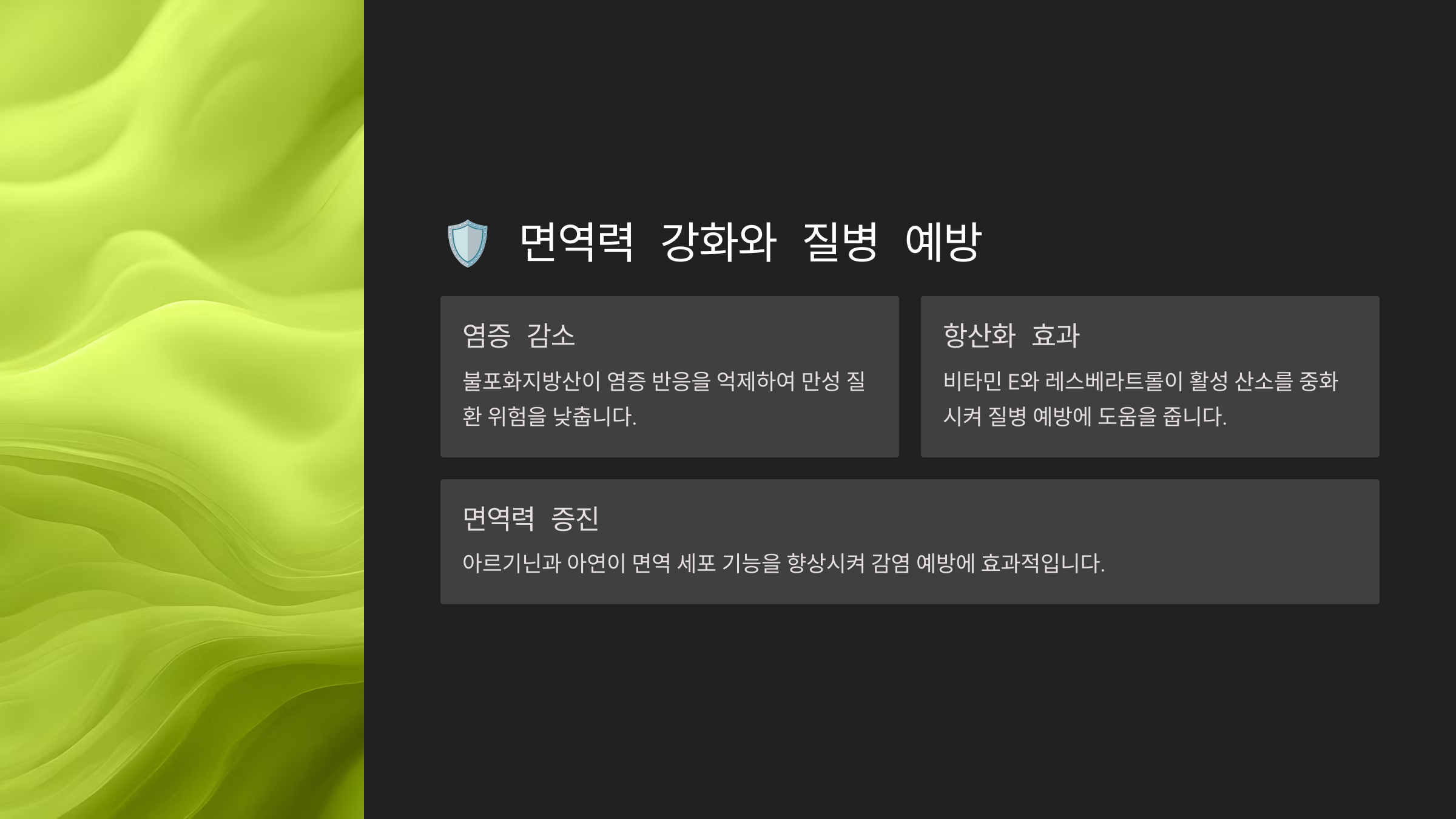 항체 생성 촉진 효과도 있어요. 땅콩의 단백질과 비타민 B6는 항체 생성에 필수적인 영양소로, 바이러스나 세균에 대한 특이적 면역 반응을 강화해요. 독감 백신 접종 후 땅콩을 섭취한 그룹의 항체 생성률이 더 높았다는 보고가 있어요.