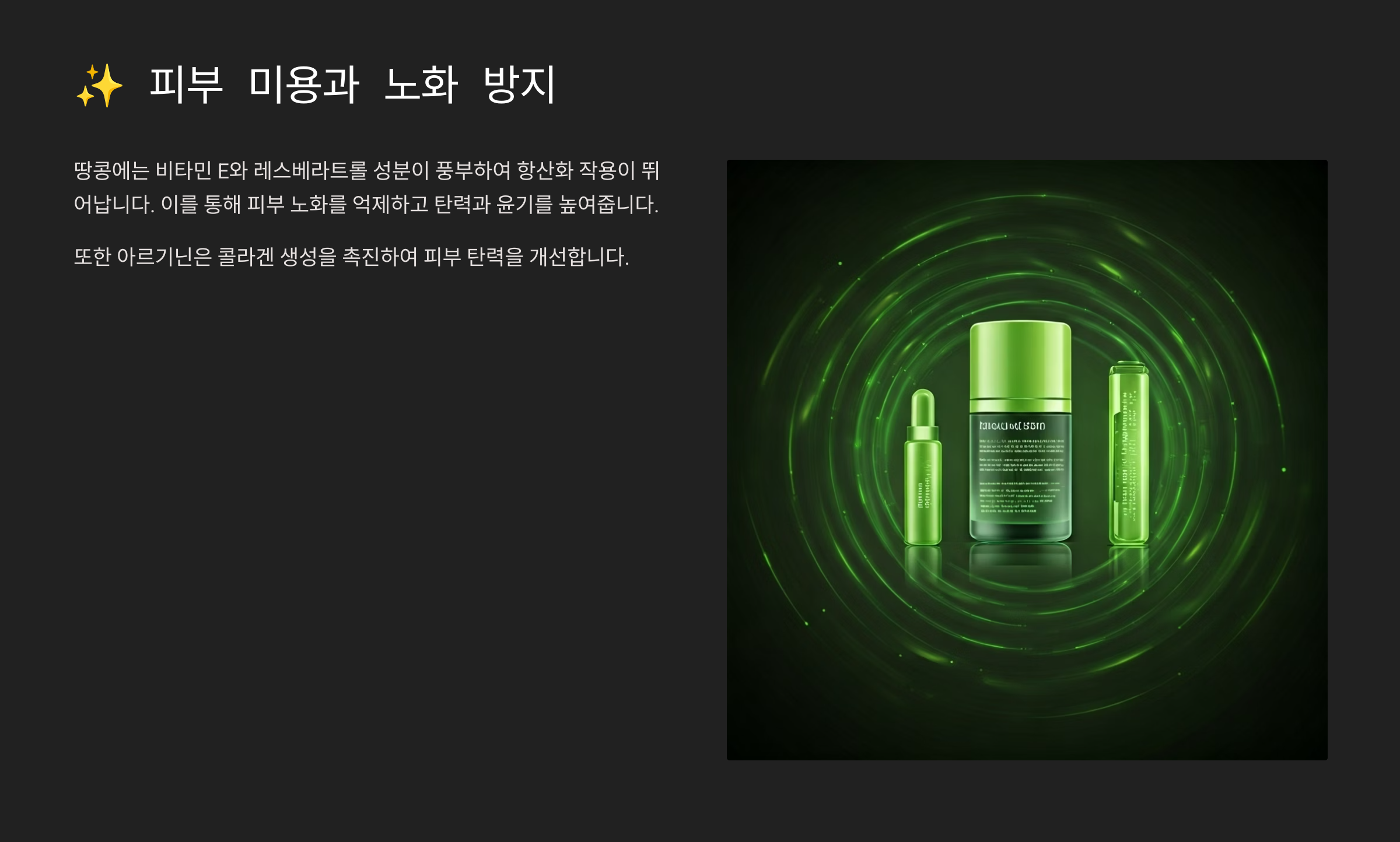 염증성 피부 질환 개선에도 도움이 돼요. 땅콩의 항염증 물질들은 여드름, 아토피, 건선 같은 피부 트러블을 완화시켜요. 특히 오메가-3 지방산은 피부 염증을 진정시키고 재생을 촉진한답니다.