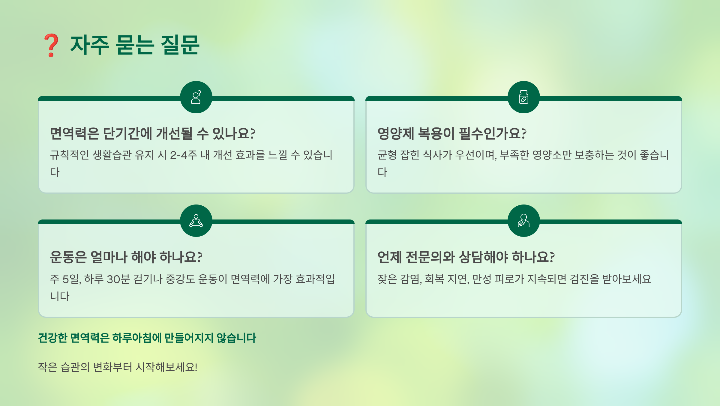 작은 생활습관 개선이 큰 변화를 만들어요. 규칙적인 생활 리듬을 유지하고, 긍정적인 마음가짐을 갖으며, 스트레스를 건강하게 관리하세요. 자연과 가까이 지내고, 깨끗하지만 과도하지 않은 환경을 만들어요. 면역력은 하루아침에 좋아지지 않지만, 꾸준한 노력으로 반드시 개선될 수 있답니다. 🌍