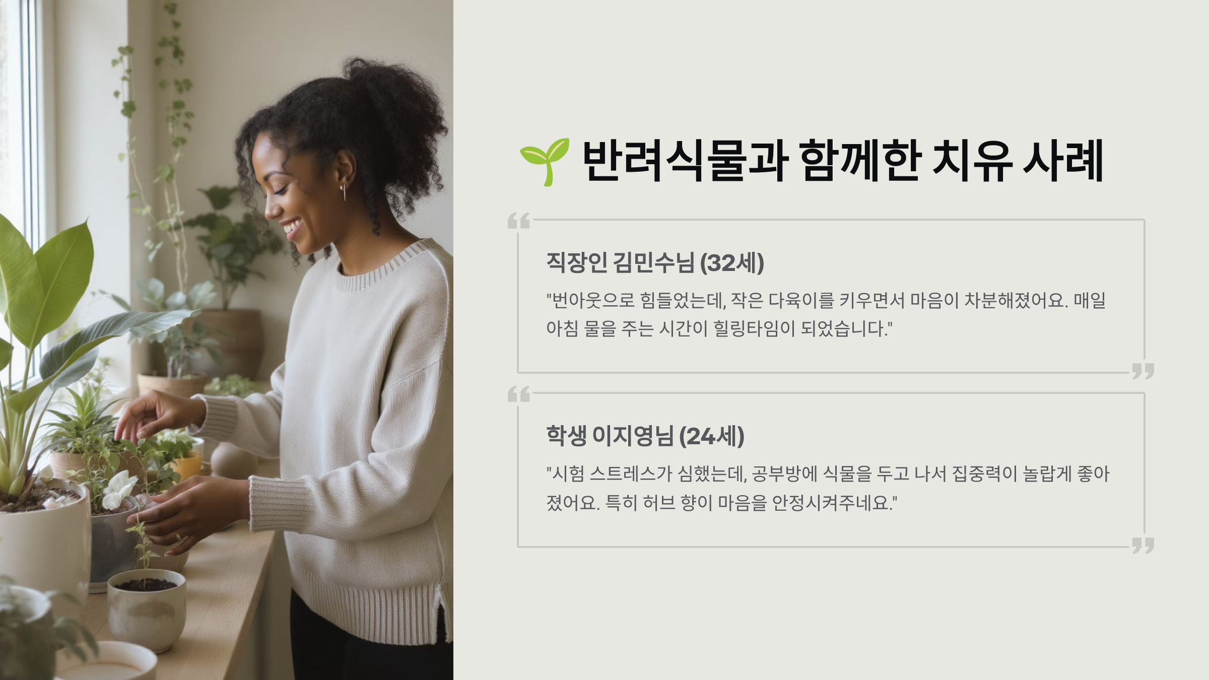 이처럼 반려식물은 나이, 성별, 직업을 불문하고 모든 사람들에게 치유와 위로를 선사해요. 작은 화분 하나가 삶을 바꾸는 기적을 만들어내는 것을 보면, 자연이 우리에게 주는 선물이 얼마나 큰지 새삼 깨닫게 되죠. 여러분도 오늘부터 작은 식물 하나와 함께 새로운 시작을 해보는 건 어떨까요? 🌱