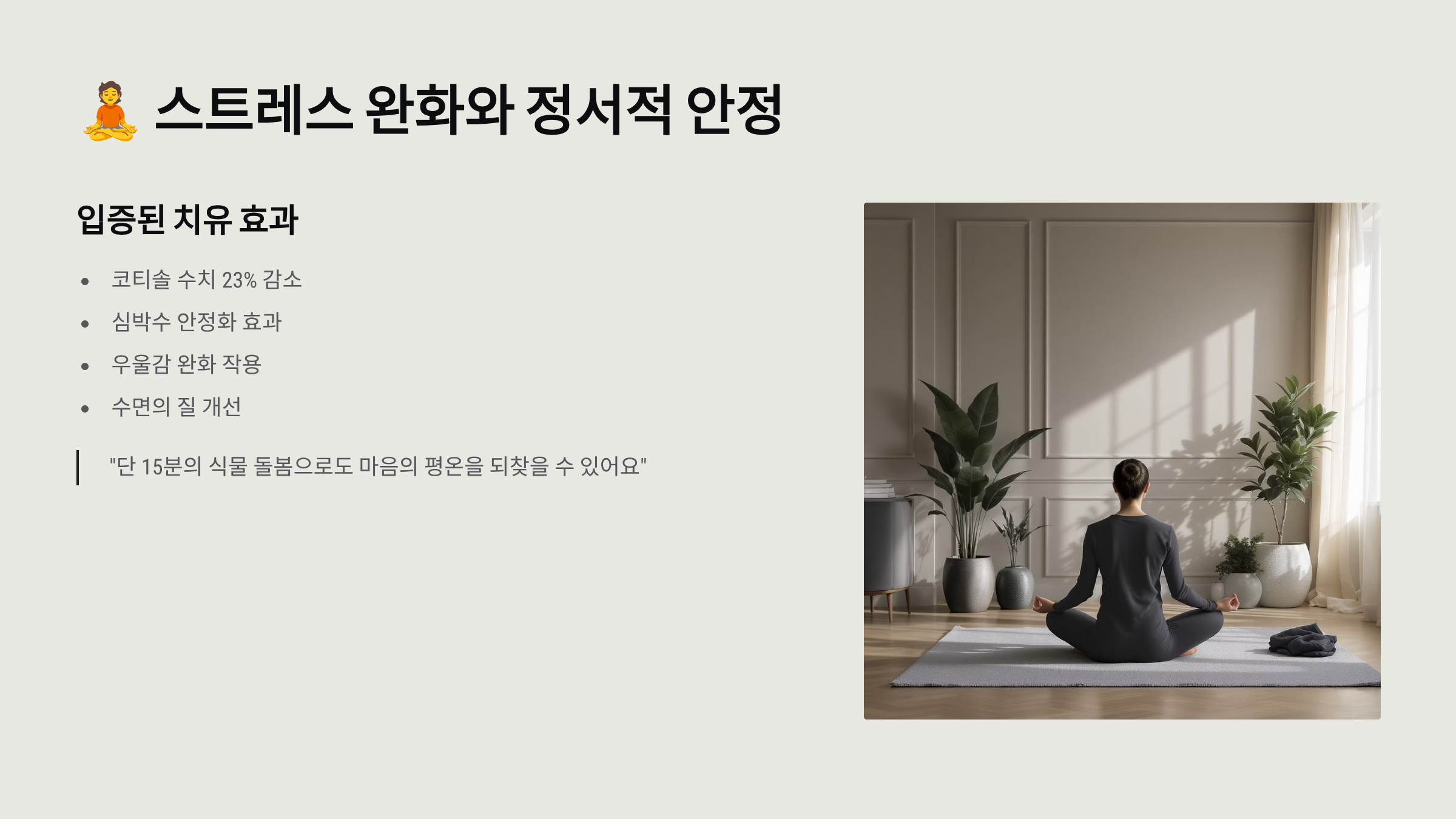 면책조항: 이 글은 일반적인 정보 제공을 목적으로 작성되었으며, 의학적 조언을 대체할 수 없습니다. 심각한 정신건강 문제가 있으신 경우 반드시 전문의와 상담하시기 바랍니다. 식물 관리 정보는 일반적인 가이드라인이며, 개별 환경에 따라 달라질 수 있습니다.