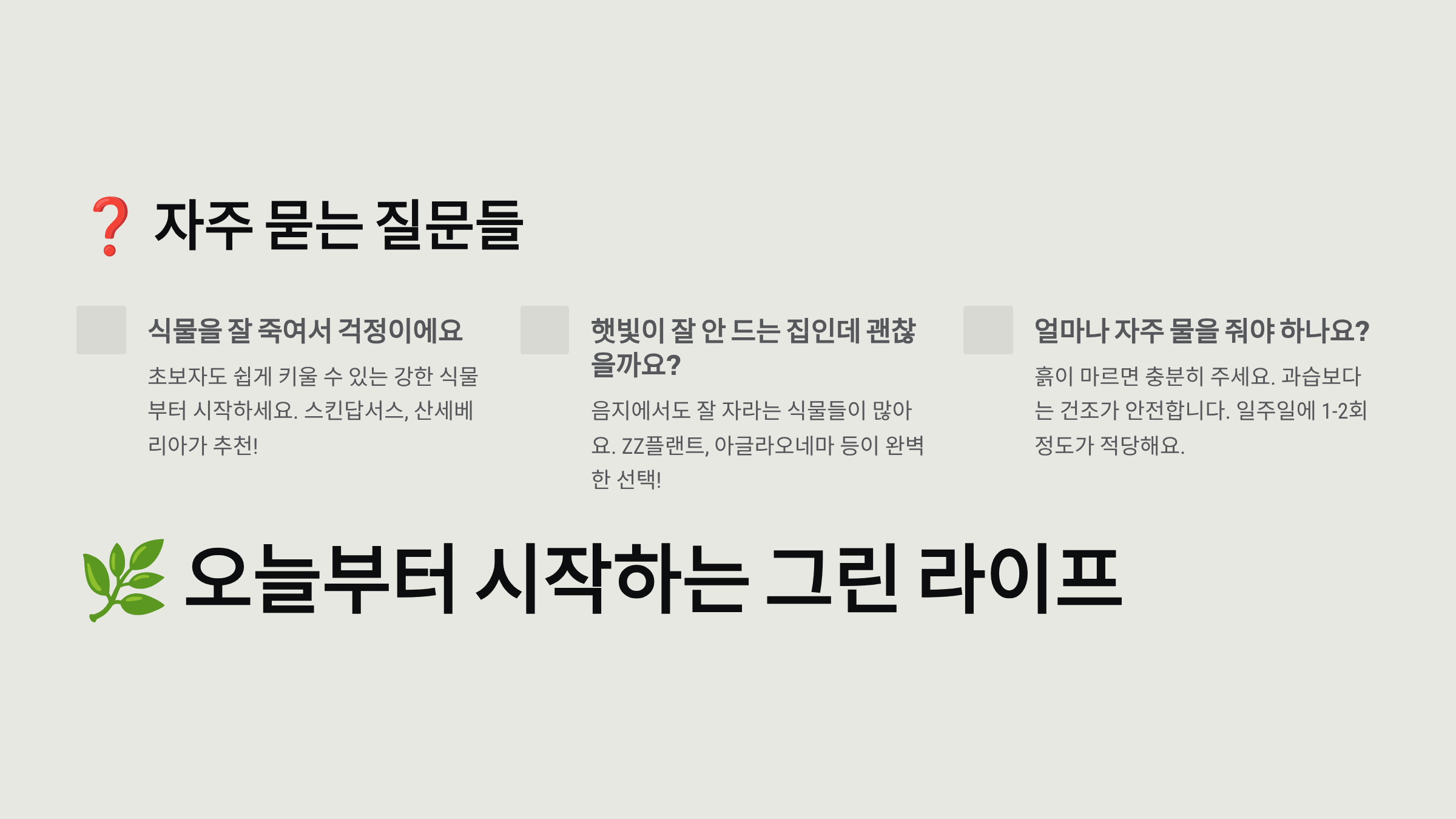 | 번아웃 | 몬스테라, 고무나무 | 아침 루틴 형성 | 업무 효율 30% 상승 |