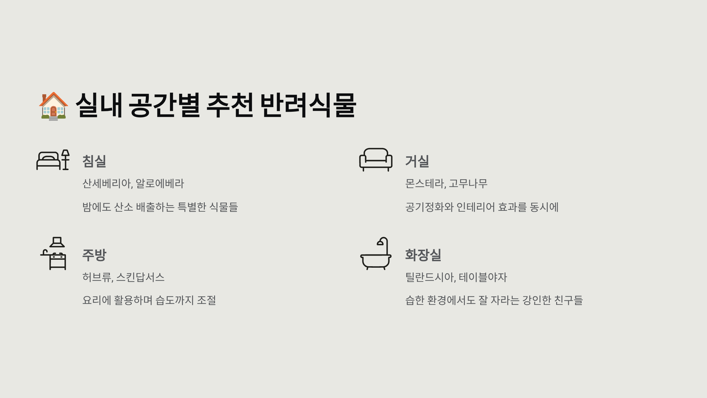 | 침실 | 스투키, 산세베리아 | 야간 산소 배출 | 건조하게 관리, 월 2회 물주기 |