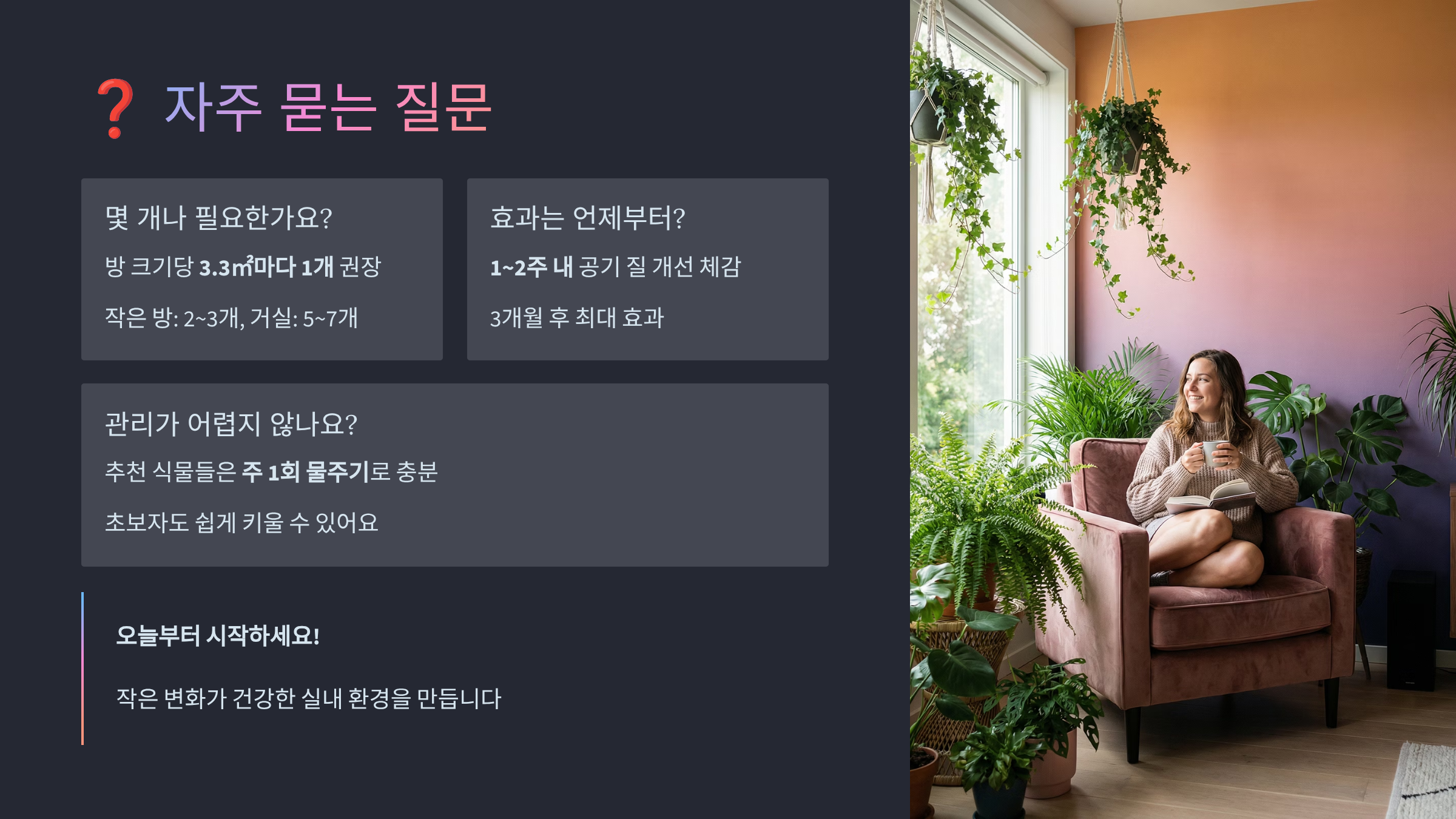 A2. NASA 기준으로는 3평당 1개지만, 한국 아파트 기준으로는 10평 방에 큰 식물 1-2개, 작은 식물 3-4개가 적당해요. 너무 많으면 밤에 이산화탄소가 증가할 수 있어요.
