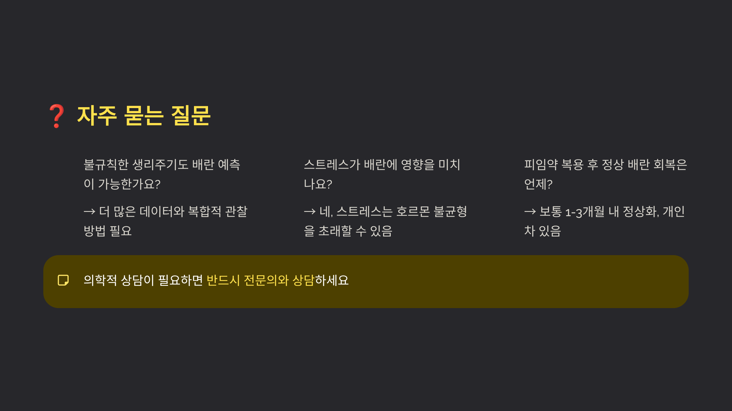 A4. 개인차가 있지만 대부분 1-3개월 내에 정상 배란이 돌아와요. 일부는 복용 중단 직후 바로 배란이 일어나기도 하고, 어떤 경우는 6개월까지 걸릴 수 있어요. 3개월이 지나도 생리가 없다면 의사와 상담하는 것이 좋아요.