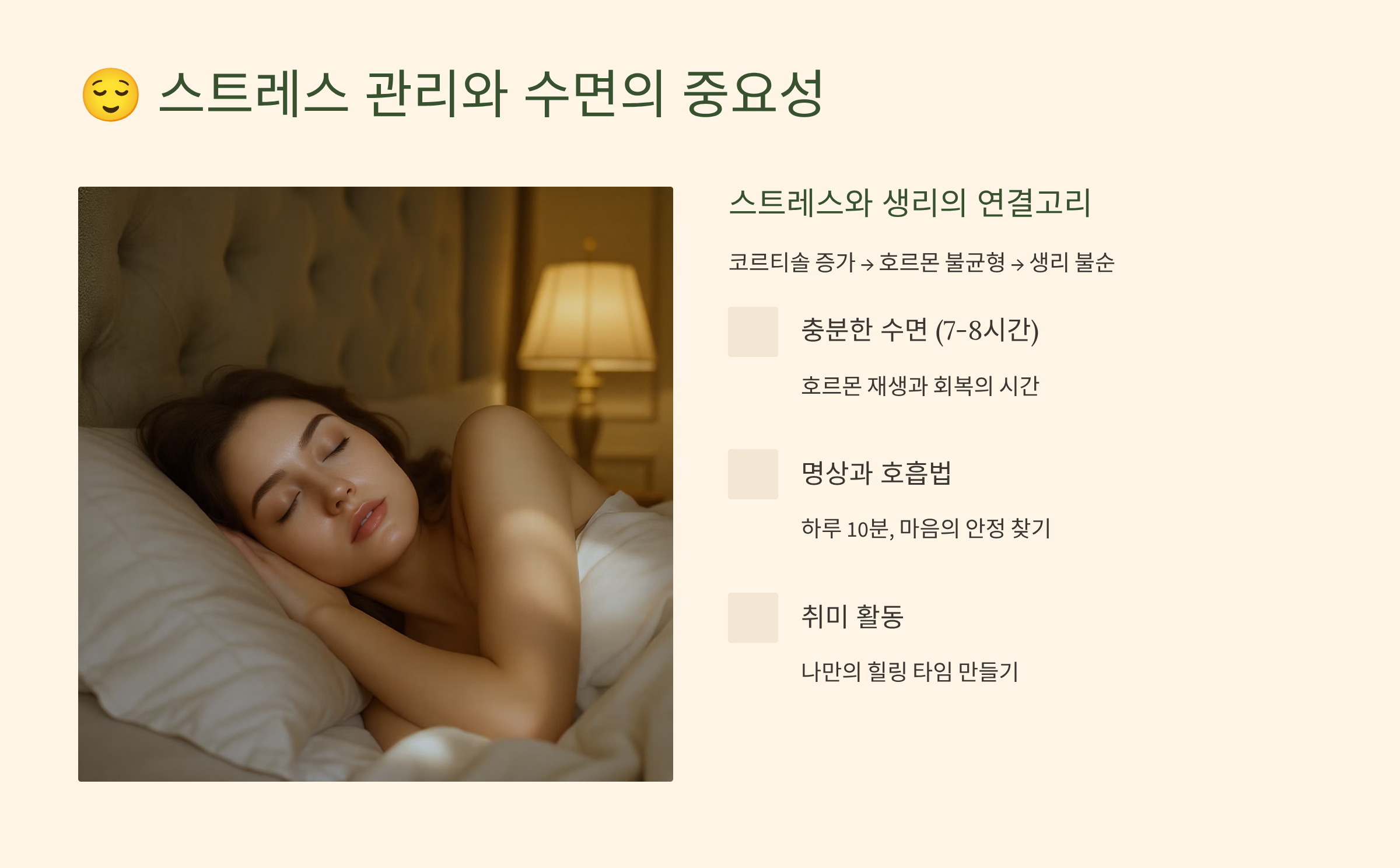 수면의 질과 양은 호르몬 분비에 직접적인 영향을 미쳐요. 멜라토닌은 밤 10시부터 새벽 2시 사이에 가장 많이 분비되는데, 이 호르몬은 난소 기능을 조절하고 생식 호르몬 분비를 돕죠. 수면 부족은 렙틴과 그렐린 같은 식욕 호르몬도 교란시켜 체중 증가로 이어질 수 있어요. 성인 여성은 하루 7-9시간의 수면이 필요하고, 가능하면 밤 11시 이전에 잠드는 것이 좋아요.