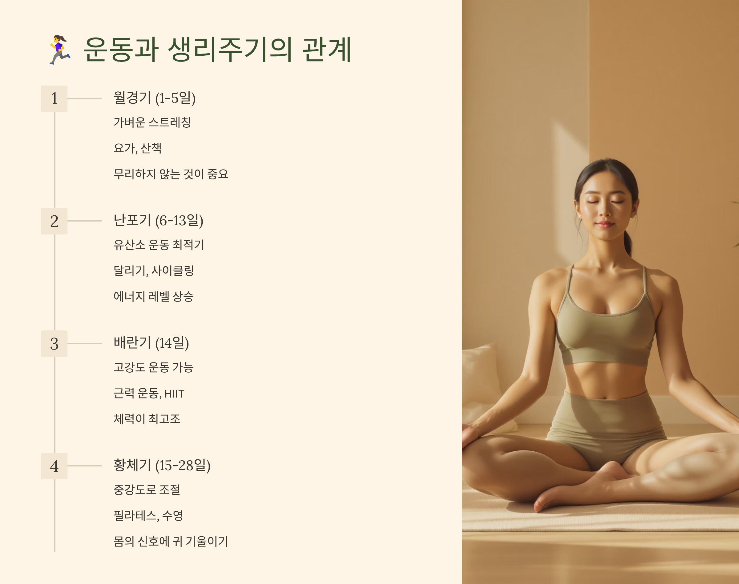 | 월경기 (1-5일) | 가벼운 요가, 산책, 스트레칭 | 저강도 (40-50%) |