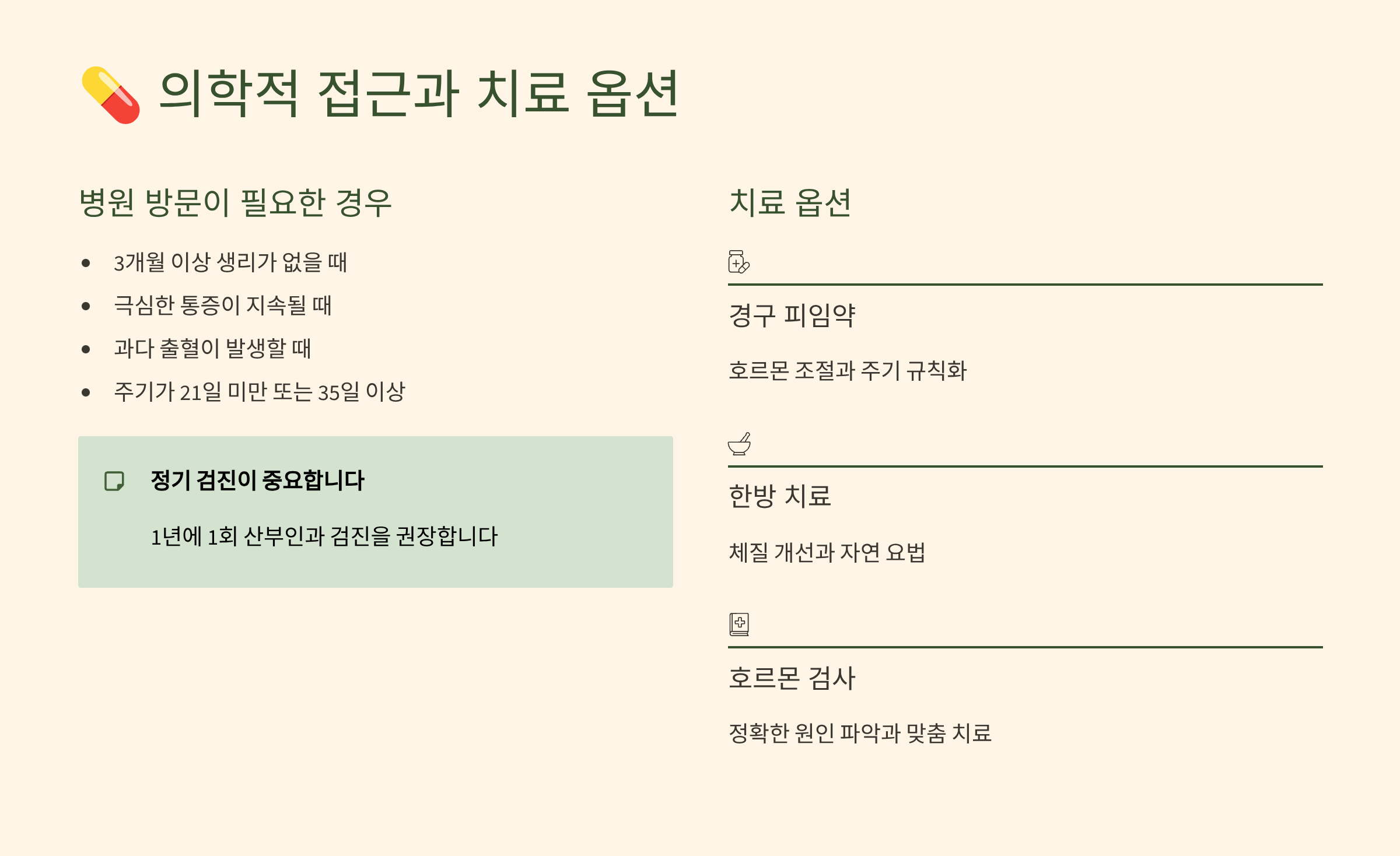 ⚠️ 면책조항: 이 글은 일반적인 정보 제공을 목적으로 작성되었으며, 의학적 조언을 대체할 수 없습니다. 개인의 건강 상태는 각자 다르므로, 생리 불순이나 관련 증상이 있으신 경우 반드시 산부인과 전문의와 상담하시기 바랍니다. 자가 진단이나 자가 치료는 위험할 수 있으며, 정확한 진단과 치료를 위해서는 전문적인 의료 서비스를 받으시는 것이 중요합니다.