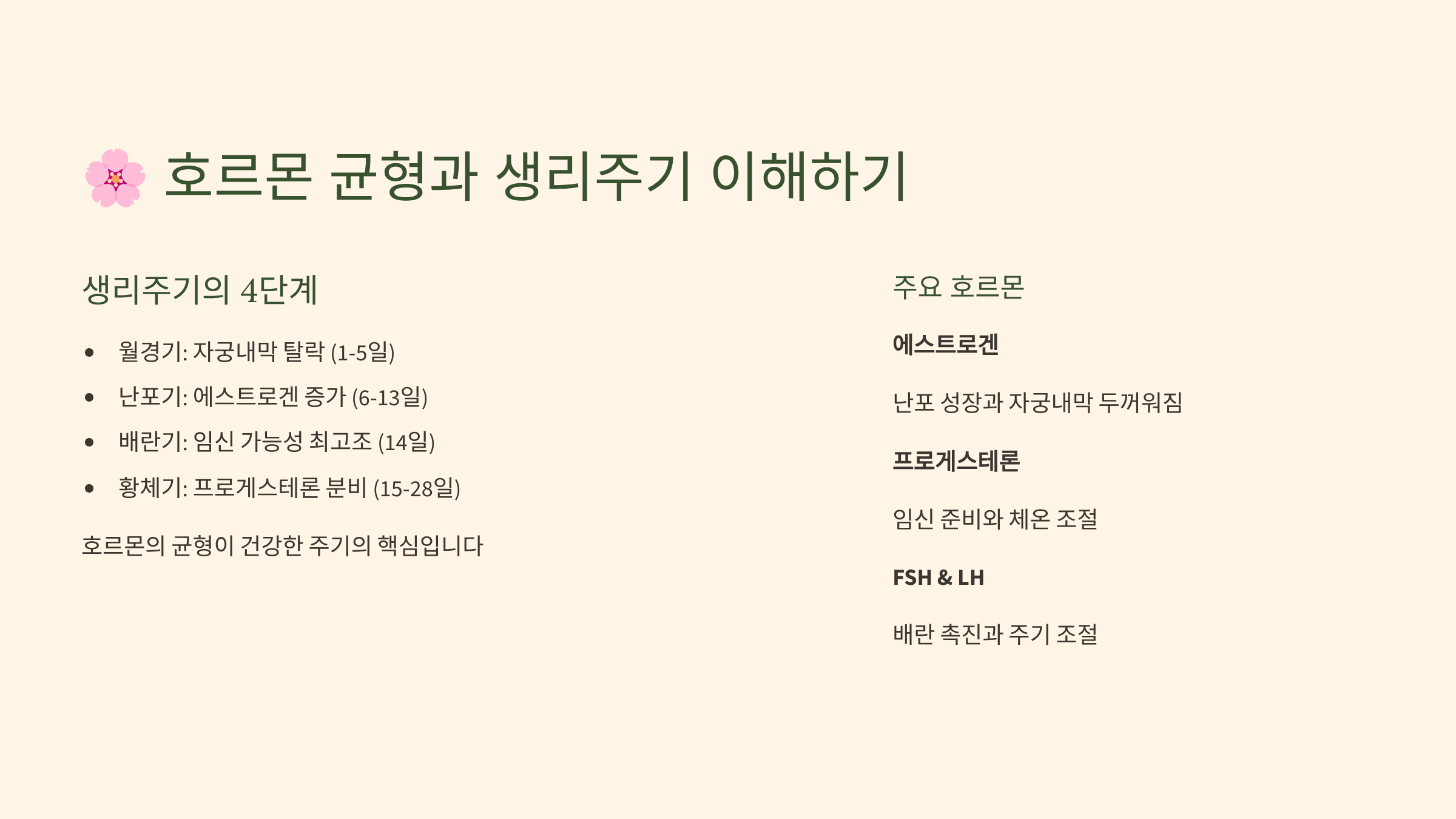 내가 생각했을 때 호르몬 균형은 전반적인 건강 상태를 반영하는 거울과 같아요. 단순히 생리주기만의 문제가 아니라 전신 건강과 연결되어 있죠. 규칙적인 생리는 뼈 건강, 심혈관 건강, 정신 건강에도 긍정적인 영향을 미쳐요. 따라서 생리주기 관리는 여성 건강의 기본이자 핵심이라고 할 수 있답니다.