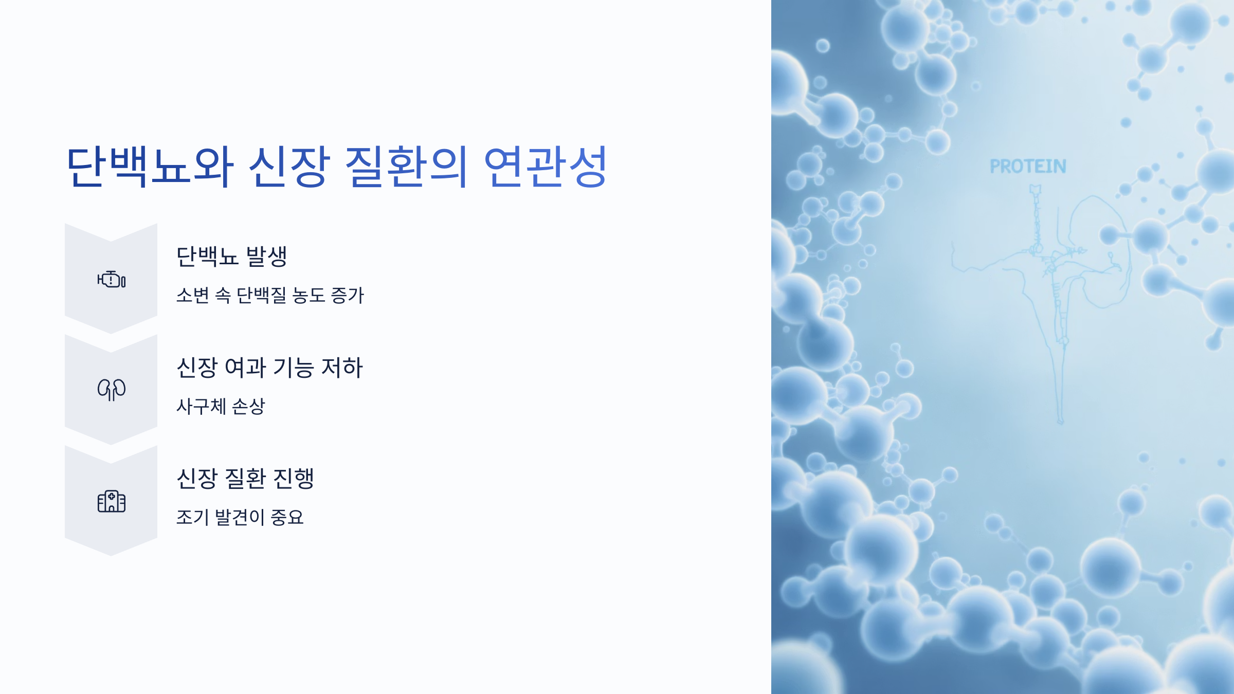 단백뇨는 신장 질환의 가장 중요한 지표 중 하나예요. 정상적인 신장은 혈액을 걸러낼 때 단백질은 걸러내지 않고 체내에 보존해요. 하지만 신장의 사구체가 손상되면 단백질이 소변으로 빠져나가게 되고, 이것이 거품을 만드는 주요 원인이 되죠.