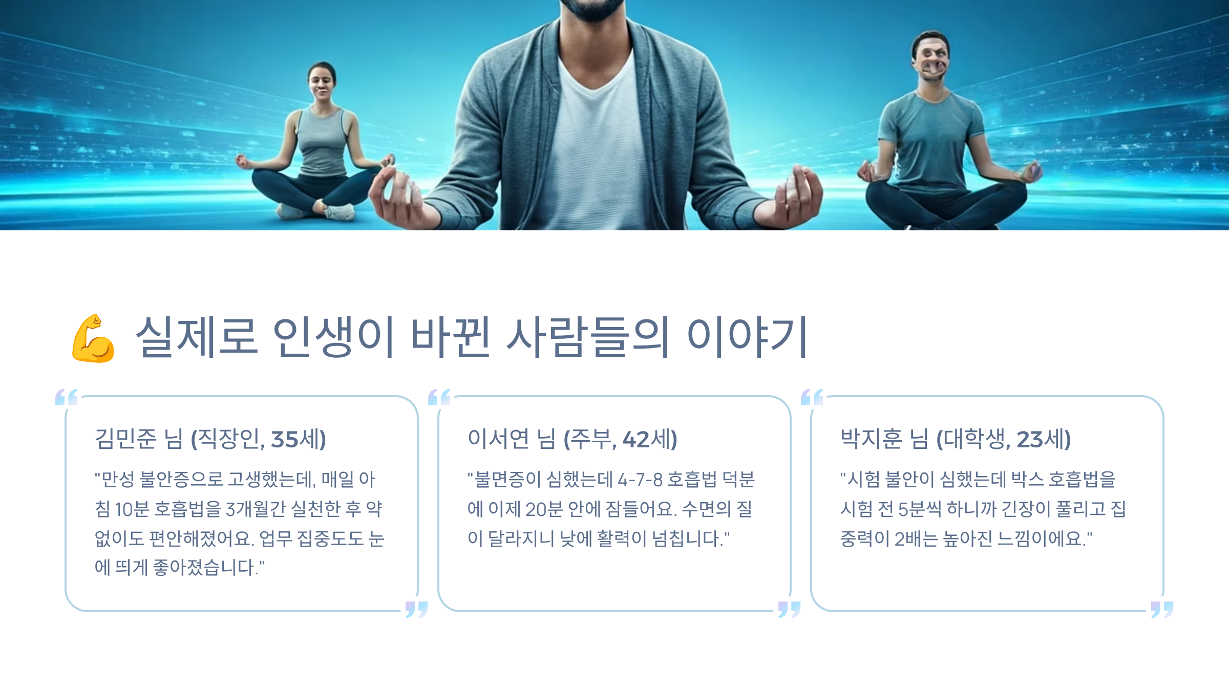 이론만으로는 와닿지 않으시죠? 실제로 깊은 호흡 습관으로 인생이 달라진 사람들의 이야기를 들려드릴게요. 이분들은 특별한 사람들이 아니에요. 우리와 같은 평범한 직장인, 주부, 학생들이에요. 다만 하루 몇 분의 호흡 연습을 꾸준히 실천했을 뿐이에요.