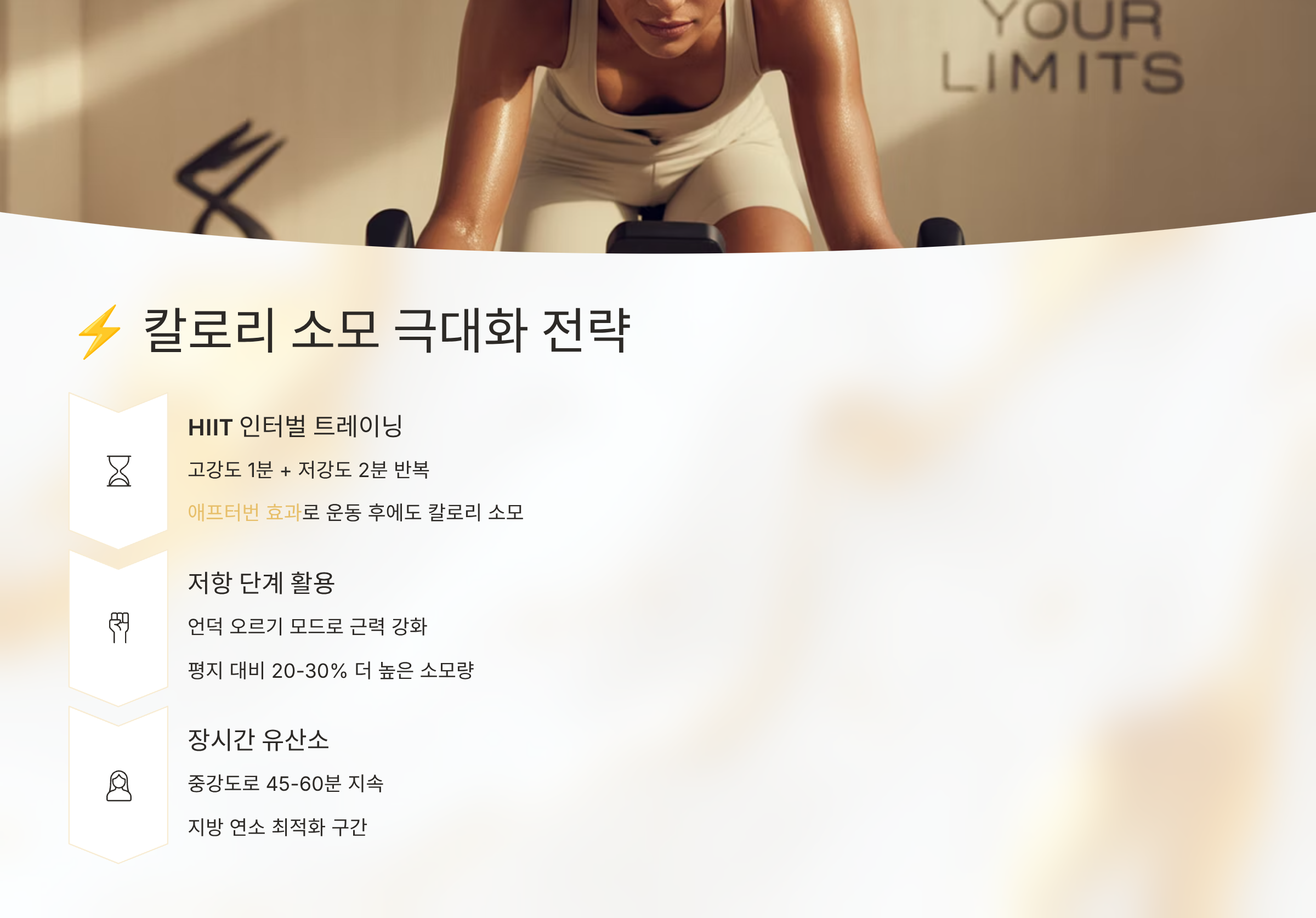 듀얼 트레이닝으로 상체도 함께 운동하면 칼로리 소모가 증가해요. 가벼운 덤벨(1-2kg)을 들고 페달링 하면서 바이셉 컬, 숄더 프레스 등을 함께 하면 전신 운동이 돼요. 15분 일반 사이클링 → 5분 덤벨 결합 운동을 반복하면 칼로리 소모가 40% 증가할 수 있어요. 균형 잡힌 몸매를 만드는 데도 효과적이랍니다! 💪