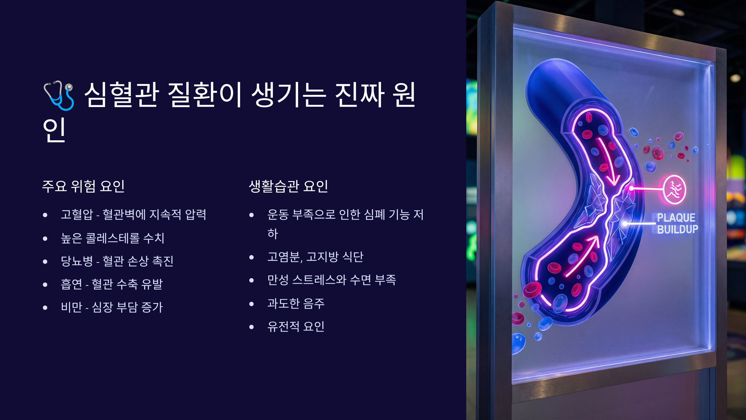 심혈관 질환의 근본 원인은 혈관 내벽의 손상이에요. 고혈압, 고지혈증, 당뇨병 같은 위험 요인들이 혈관벽을 공격하면서 시작되죠. 손상된 부위에 콜레스테롤이 쌓이고, 염증이 생기면서 혈관이 좁아지는 거예요. 이 과정이 수십 년에 걸쳐 서서히 진행되기 때문에 예방이 중요한 거랍니다.