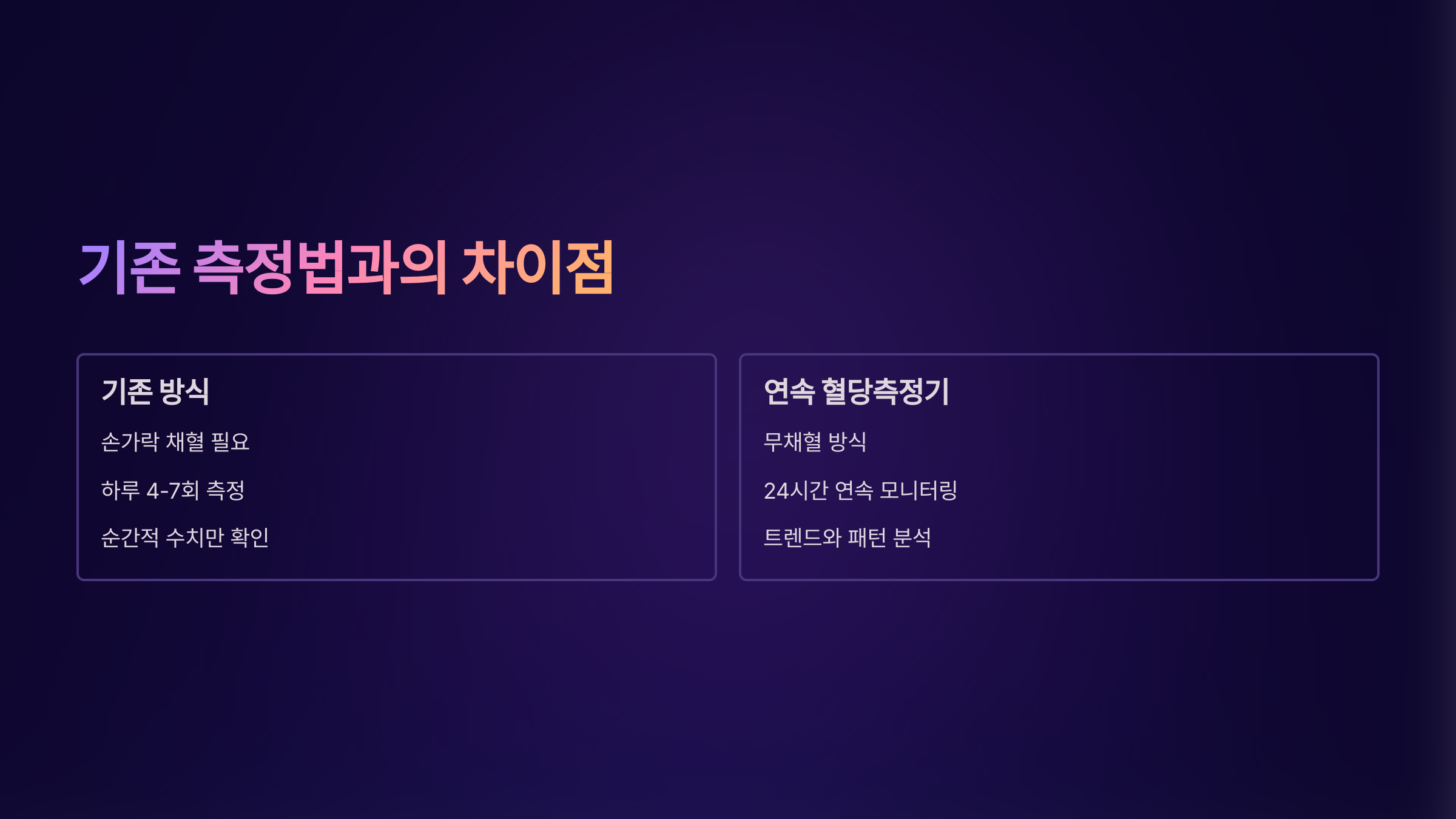 가장 큰 차이점은 측정 빈도예요. 자가혈당측정기는 하루에 몇 번만 측정하기 때문에 혈당의 전체적인 변화를 파악하기 어려워요. 반면 연속 혈당측정기는 5분마다 측정해서 하루 288개의 데이터를 수집하니까 혈당의 모든 변화를 놓치지 않고 확인할 수 있어요.