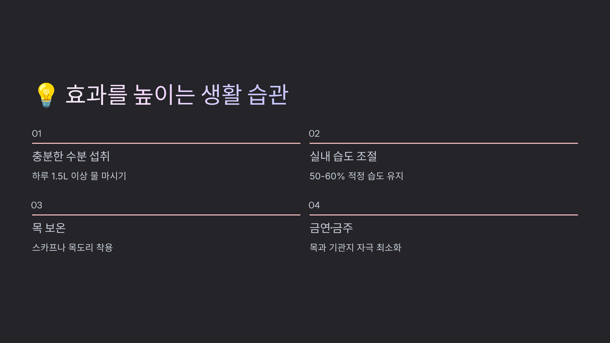 | 카페인 음료 병용 | 목 건조 악화 | 허브차로 대체 |