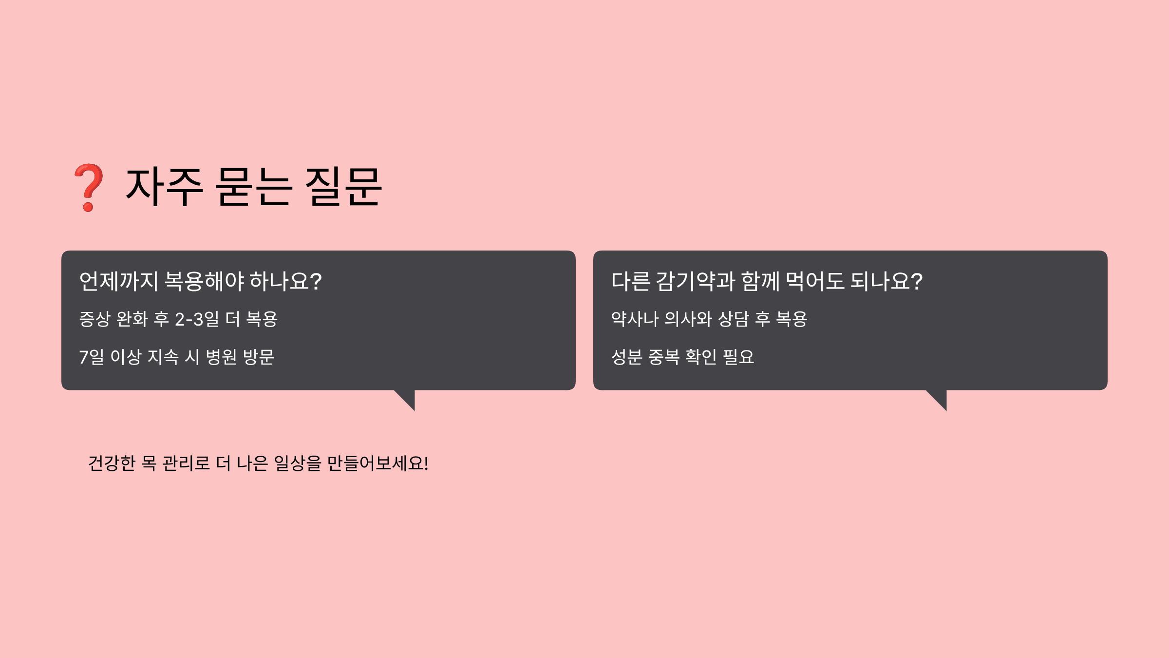 면책 조항: 이 글은 일반적인 정보 제공을 목적으로 작성되었으며, 의학적 조언을 대체할 수 없습니다. 증상이 지속되거나 악화되는 경우 반드시 의료 전문가와 상담하시기 바랍니다. 개인의 건강 상태에 따라 용각산의 효과와 부작용이 다를 수 있으므로, 복용 전 약사 또는 의사와 상담하는 것이 안전합니다.