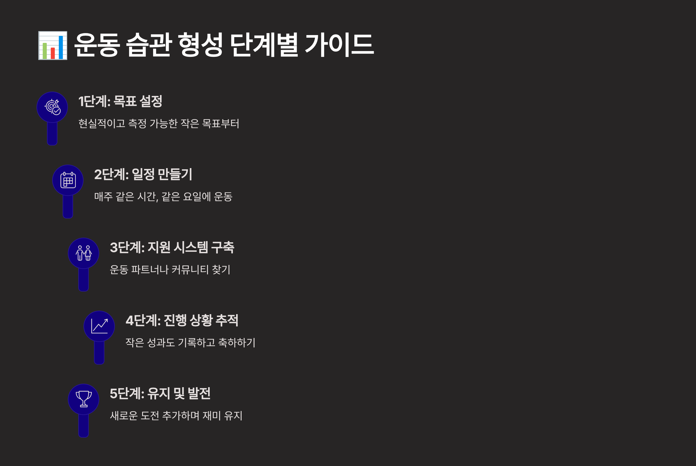 각 단계에 맞는 전략을 사용하면 더 효과적으로 운동 습관을 형성할 수 있어요. 인식 단계에서는 건강검진 결과를 눈에 잘 보이는 곳에 붙여두거나, 운동하는 친구들과 어울리면서 자극을 받는 게 도움이 돼요. 준비 단계에서는 80% 정도 준비되면 바로 시작하는 게 좋아요. 실행 단계에서는 작은 목표로 시작하고, 습관화 단계에서는 새로운 도전을 추가해서 지루함을 없애는 게 효과적이에요.