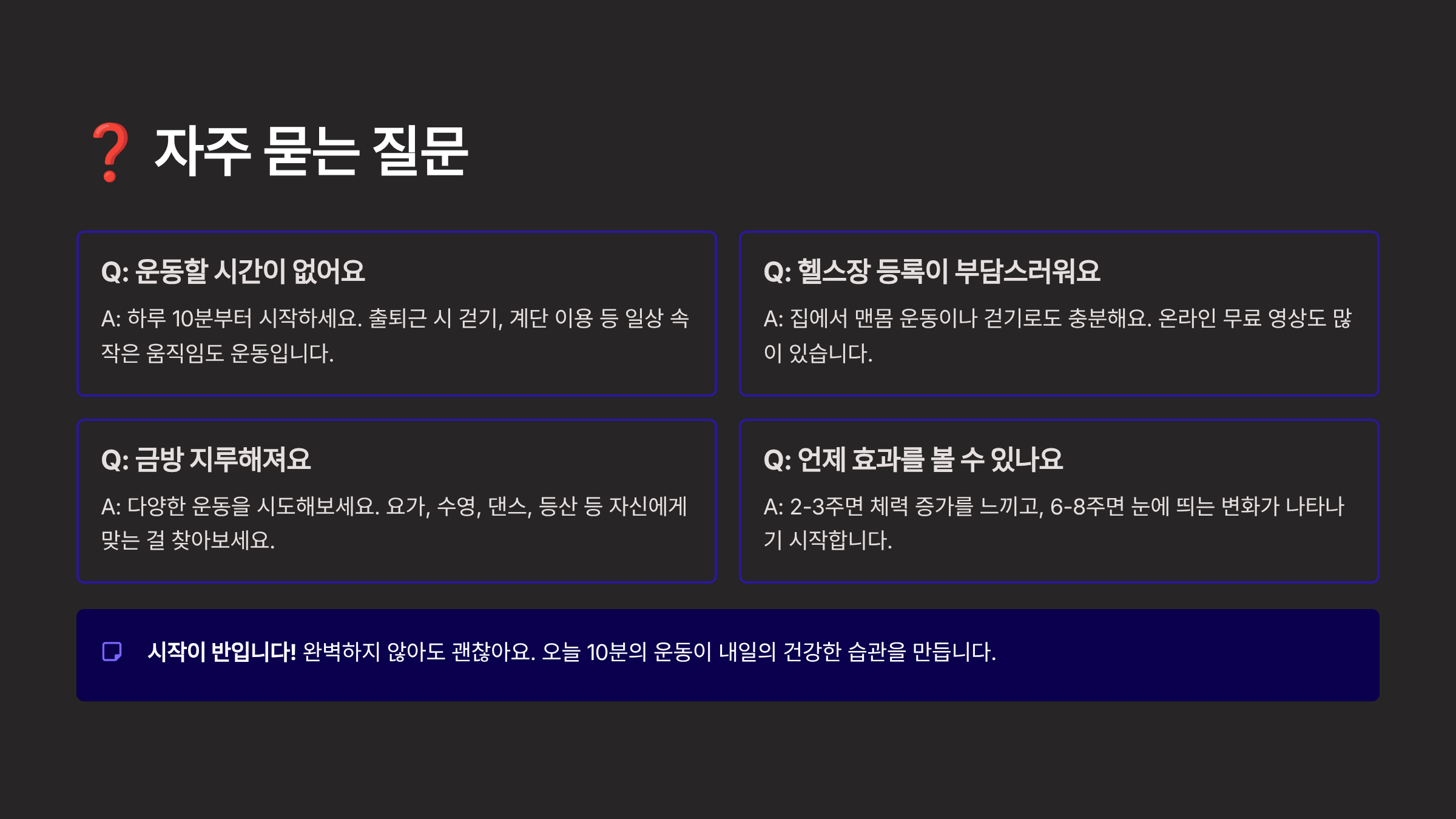 시간이 없다는 건 핑계일 수 있어요. 하루에 스마트폰을 보는 시간은 평균 3-4시간이에요. 그중 10분만 운동에 투자한다면 어떨까요? 넷플릭스 보면서 스쾃 10개만 해도 돼요. 출퇴근길에 한 정거장 일찍 내려서 걸어도 돼요. 시간은 만드는 거예요. 우선순위만 바꾸면 돼요.
