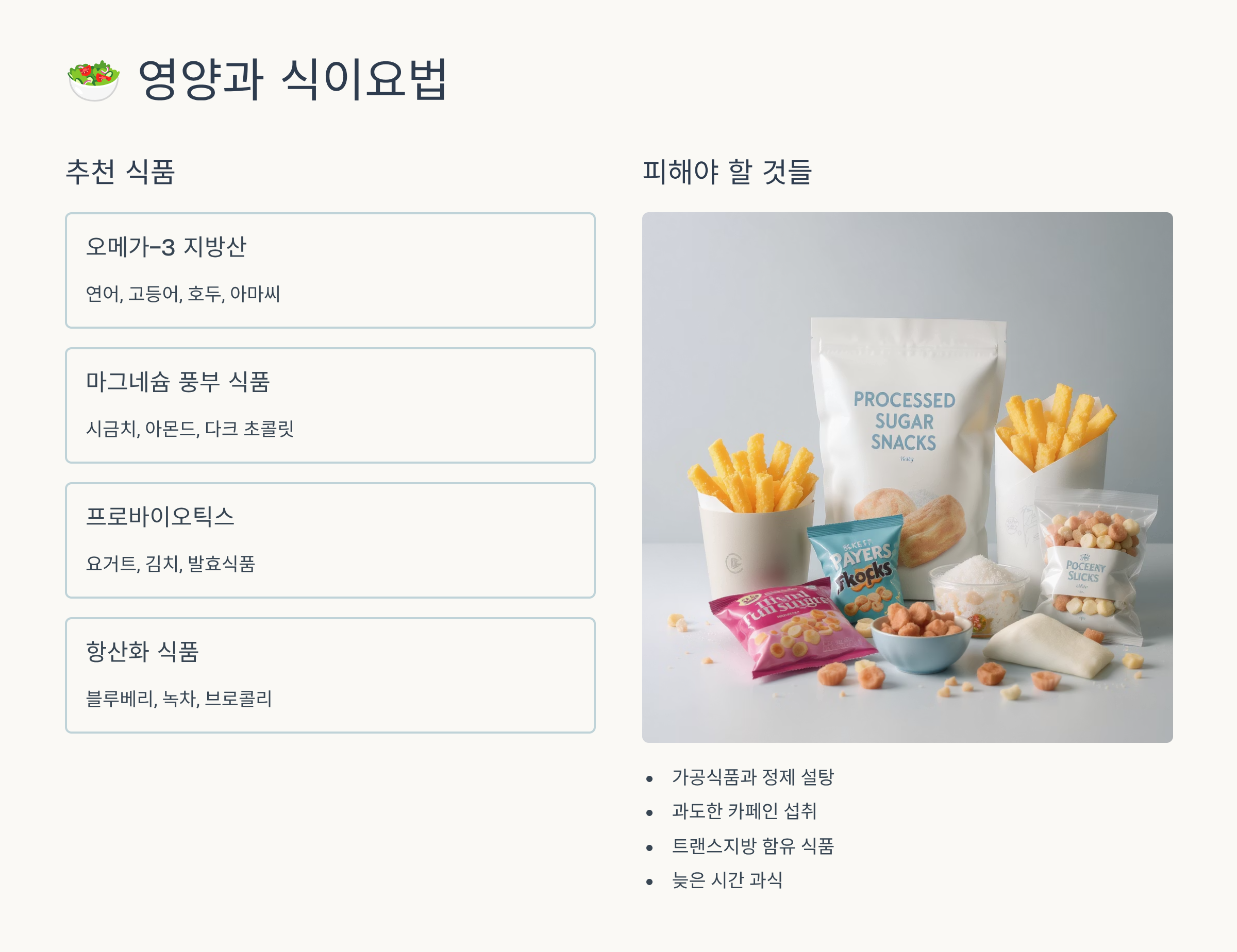 | 비타민 B군 | 통곡물, 콩류, 계란 | 신경전달물질 합성 | 일일 권장량 |