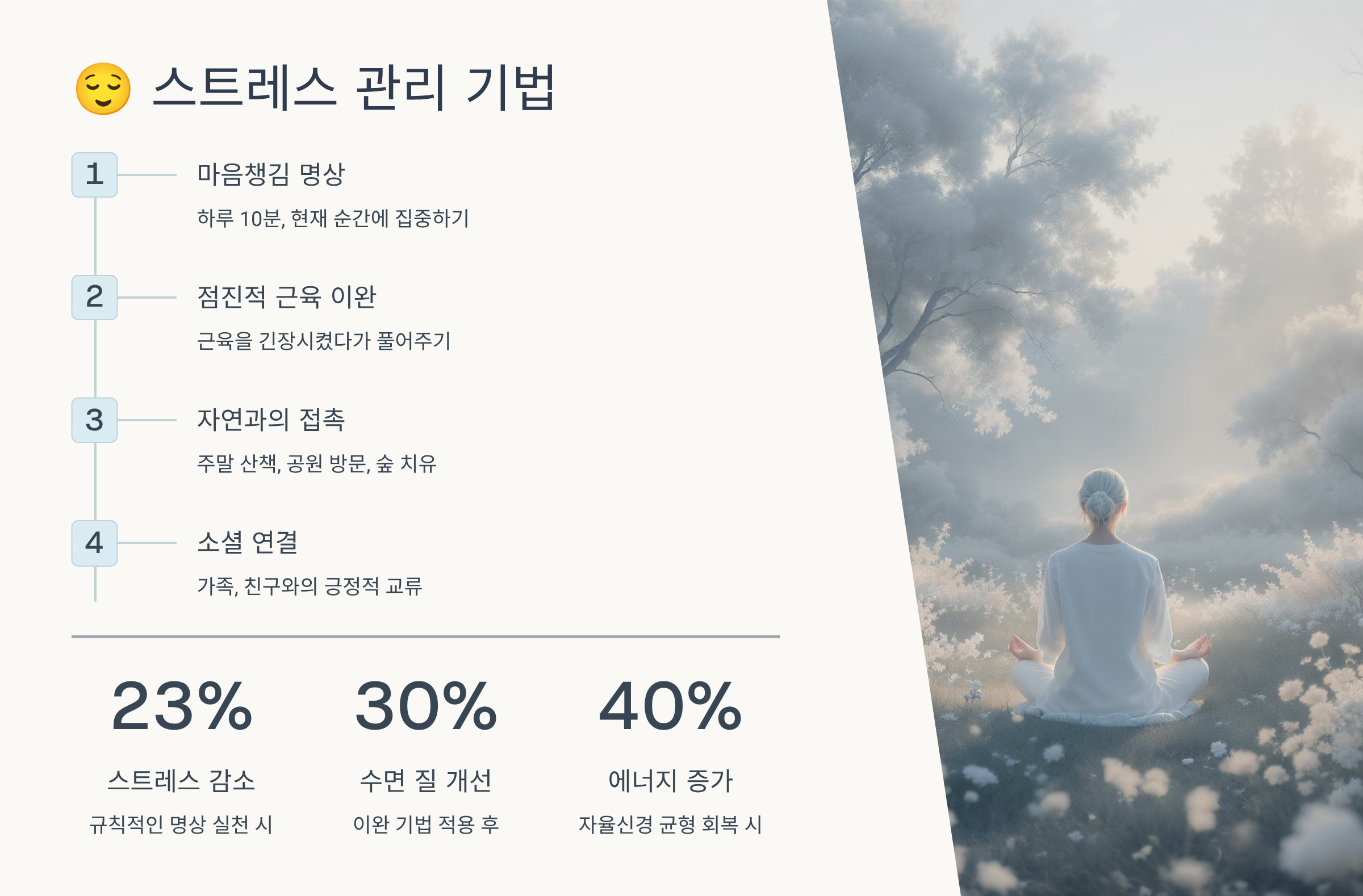 명상은 과학적으로 입증된 최고의 스트레스 관리법이에요. 하루 10-20분의 명상만으로도 코르티솔 수치가 23% 감소하고, 전전두엽 피질이 두꺼워져 감정 조절 능력이 향상된답니다. 마음 챙김 명상(MBSR)은 현재 순간에 집중하여 자율신경계를 안정시키는 기법이에요. 호흡에 집중하거나 신체 스캔, 걷기 명상 등 다양한 방법이 있어요. 명상 앱을 활용하면 초보자도 쉽게 시작할 수 있답니다.
