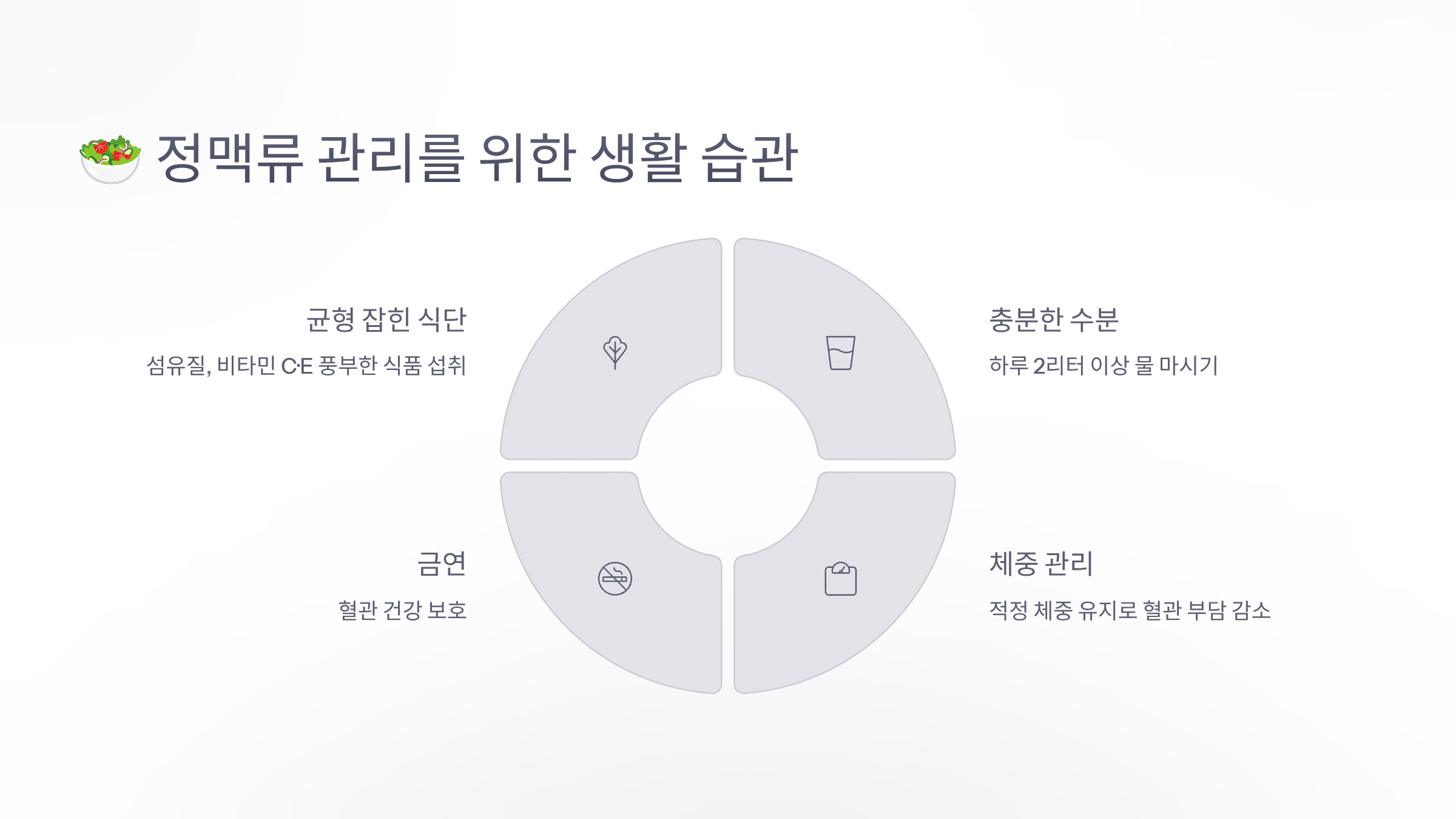 생활 습관 개선도 놓치지 마세요. 뜨거운 물에 오래 목욕하거나 사우나를 자주 하는 것은 정맥을 확장시켜 정맥류를 악화시킬 수 있어요. 꽉 끼는 옷이나 벨트는 혈액 순환을 방해하니 피하고, 하이힐보다는 굽이 3~4cm 정도인 편한 신발을 신는 것이 좋답니다. 잠잘 때 다리를 심장보다 높게 올려놓으면 정맥 혈액의 귀환을 도울 수 있어요.