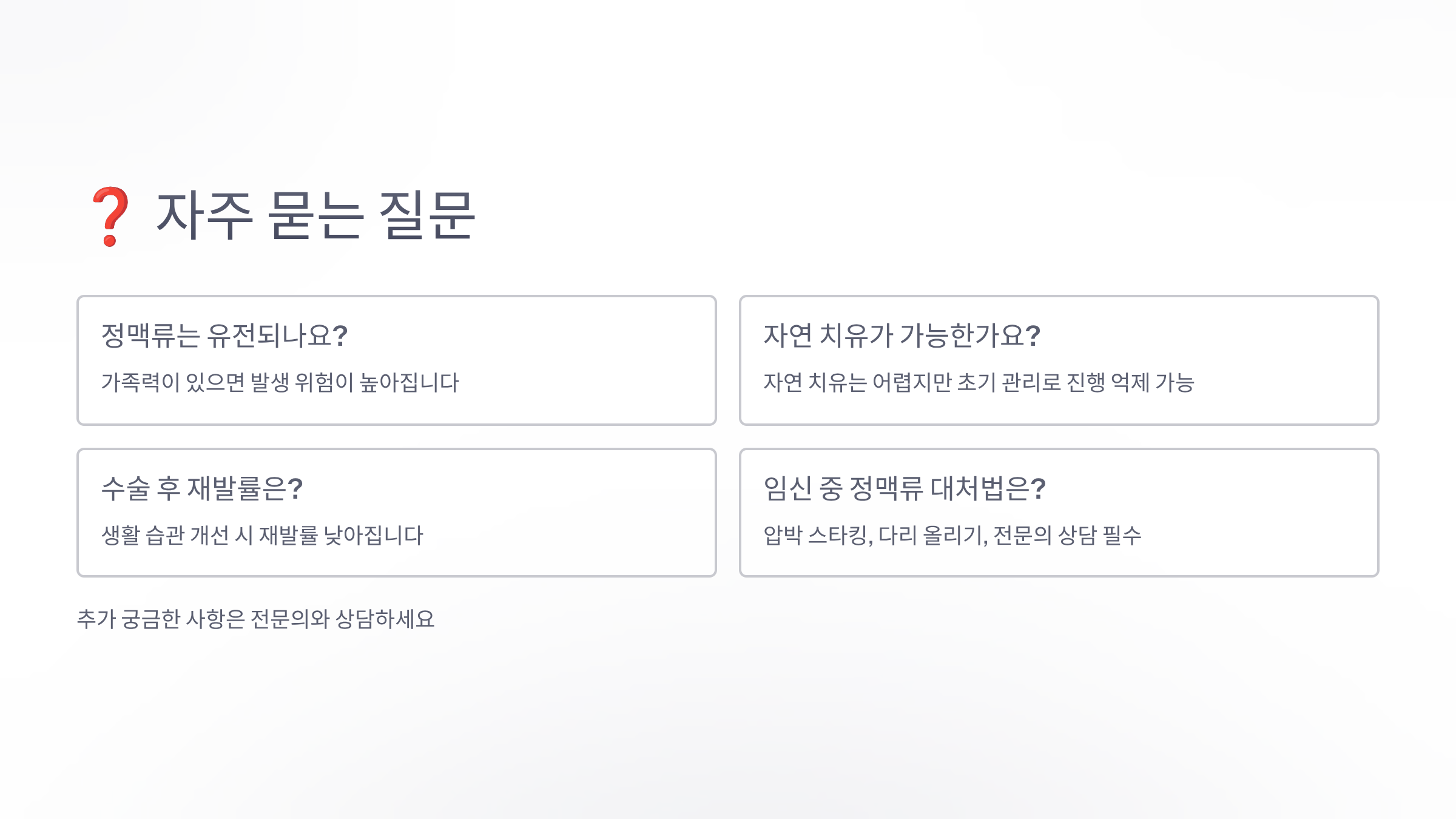 A5. 정맥류는 수술 후에도 재발할 수 있어요. 재발률은 수술 방법에 따라 다르지만 대략 10~30% 정도예요. 수술로 문제가 있는 정맥을 제거해도 다른 정맥에서 새로 발생할 수 있기 때문이죠. 수술 후에도 압박 스타킹 착용, 체중 관리, 규칙적인 운동 등 지속적인 관리가 필요하답니다.