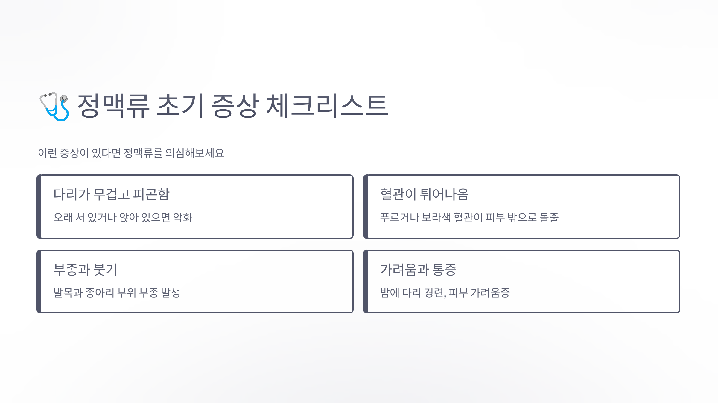 정맥류는 다리 정맥의 판막 기능이 약해지면서 혈액이 역류하고 정맥이 확장되는 질환이에요. 초기에는 미세한 증상들이 나타나지만 많은 분들이 단순 피로로 여기고 지나치는 경우가 많답니다. 정맥류는 조기에 발견하고 관리하면 진행을 막을 수 있기 때문에 초기 증상을 아는 것이 정말 중요해요.