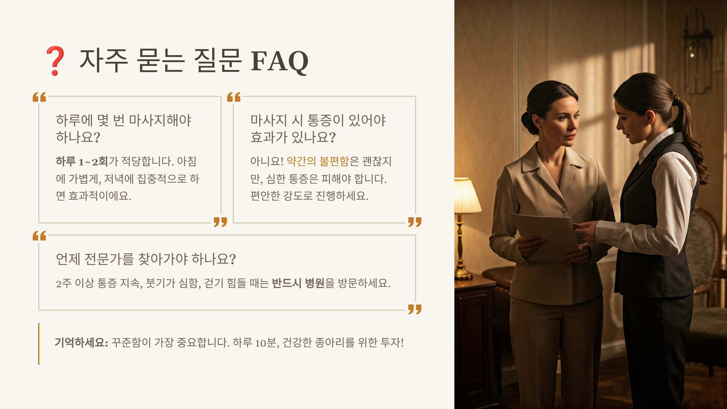특히 오래 서 있거나 앉아 있는 분들, 운동 후 근육 회복이 필요한 분들, 저녁마다 다리가 붓는 분들에게 강력히 추천해요. 마사지와 함께 충분한 수분 섭취, 규칙적인 스트레칭, 편안한 신발 착용 같은 생활습관을 함께 실천하면 종아리 건강을 오래오래 유지할 수 있어요. 오늘부터 바로 시작해 보세요!