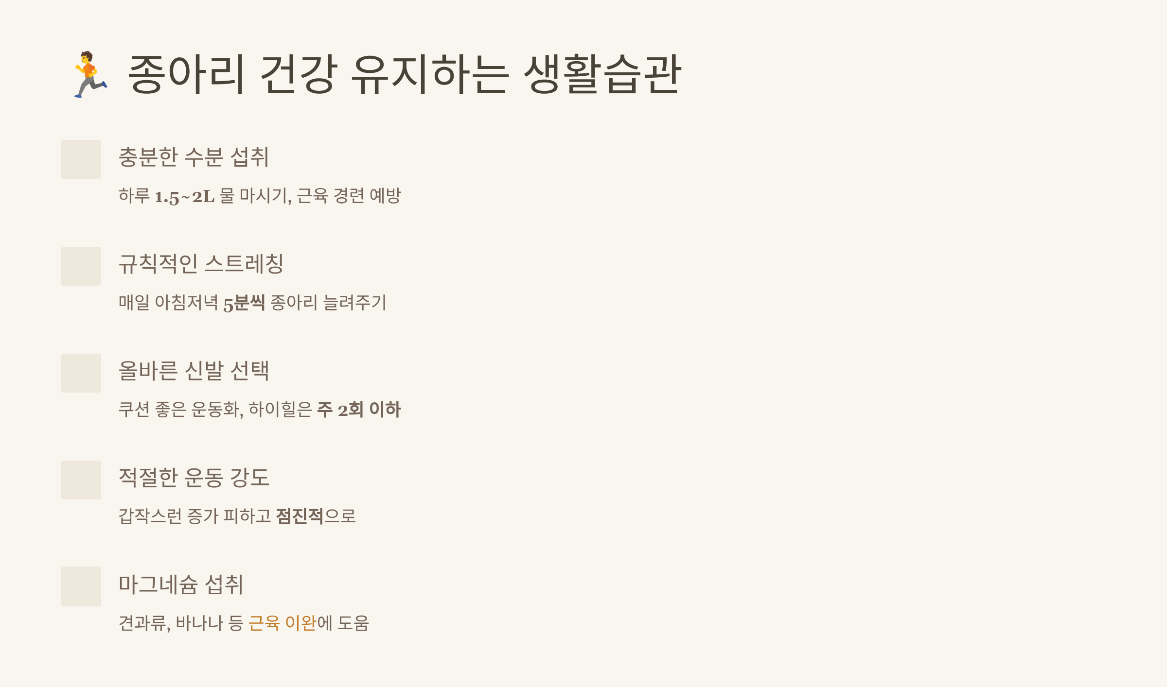 | 수분 섭취 | 하루 2L 물 | 경련 예방 |